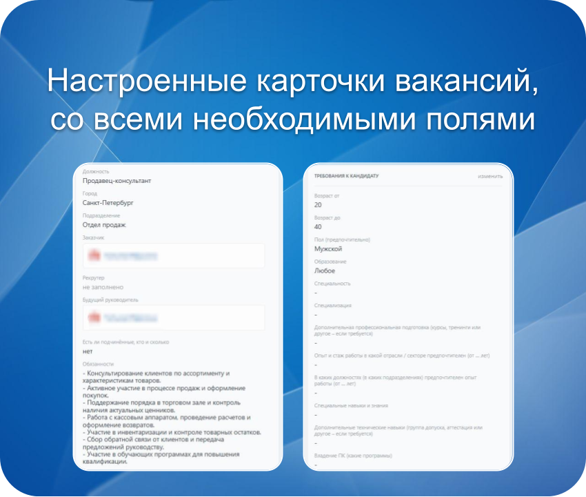 Создавайте карточку вакансии, заполняйте поля необходимыми данными. Взаимодействуйте с ответственным лицом, согласовывайте вакансию. Фиксируйте результаты публикации.