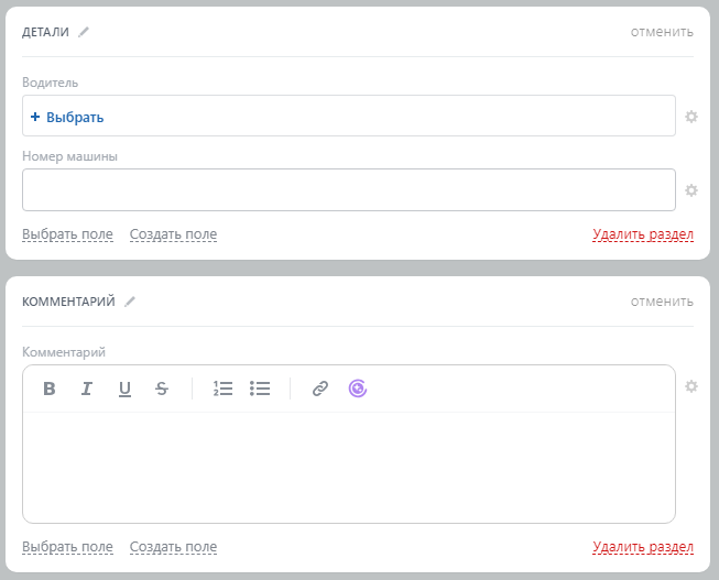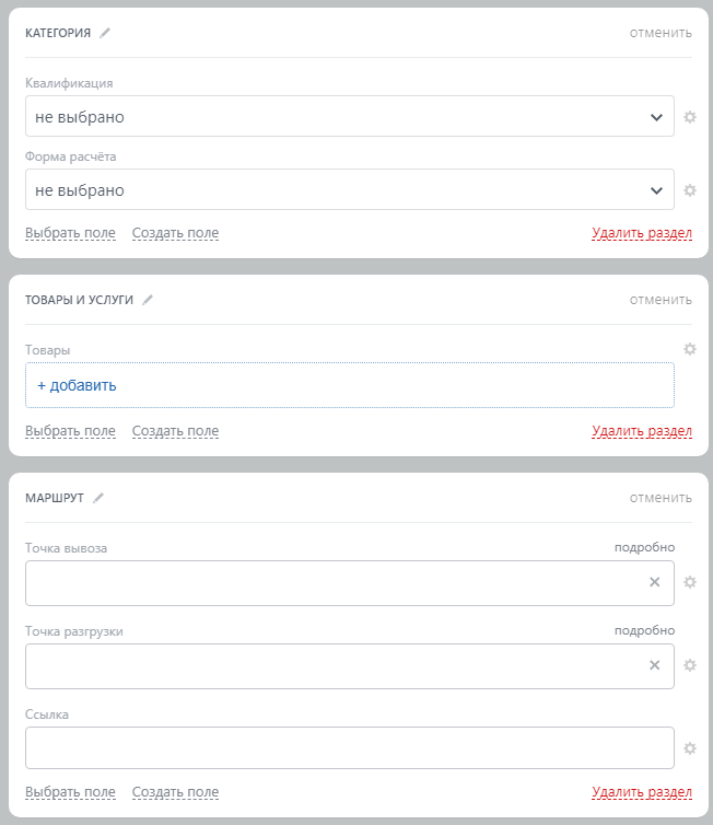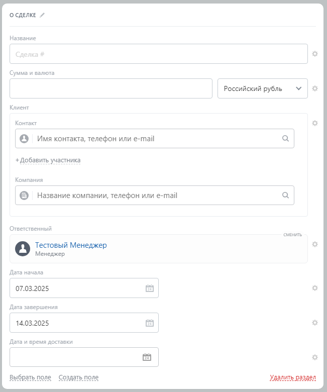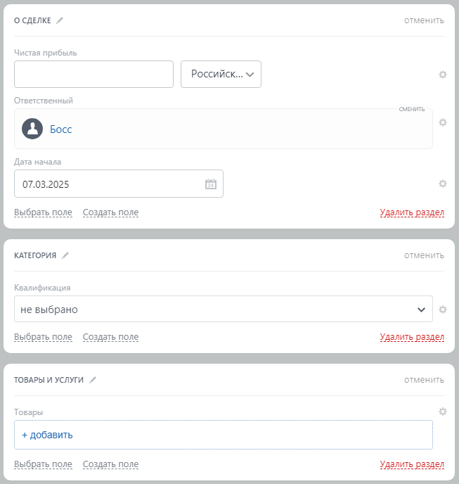 Карточки лидов, сделок, контактов и компаний включают только необходимые поля, так же добавлены пользовательские поля, установлена обязательность заполнения полей на определенных стадиях.