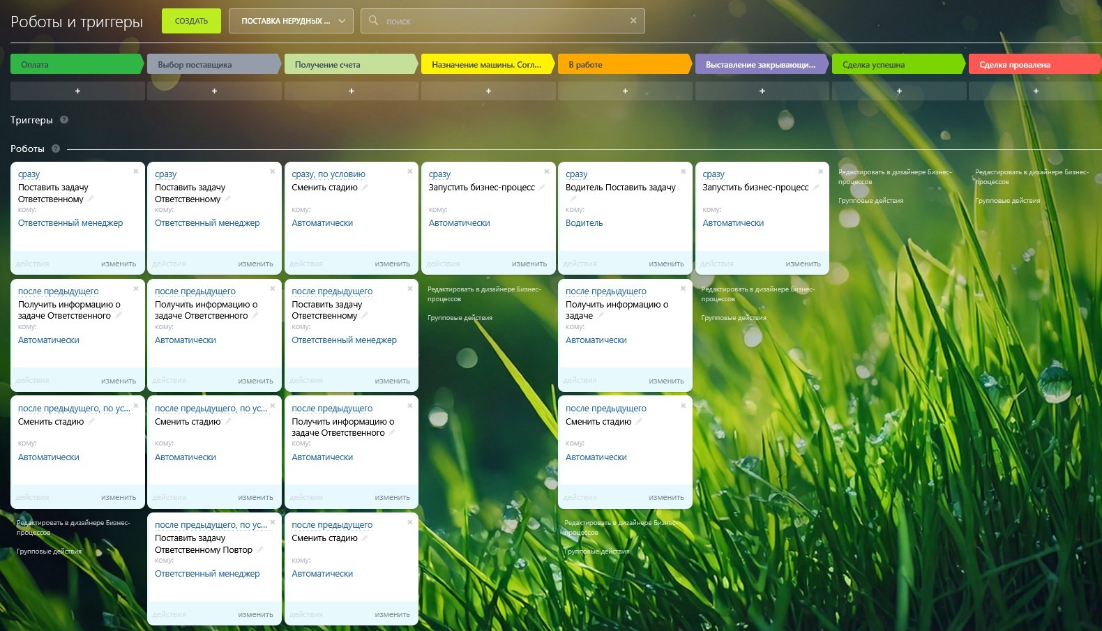 На этапах воронки в CRM настроены автоматические задачи. Они помогают менеджеру совершать необходимые действия для перехода сделки на следующий этап и напоминают о заполнении обязательных полей. Реализован автоматический переход по стадиям воронки.