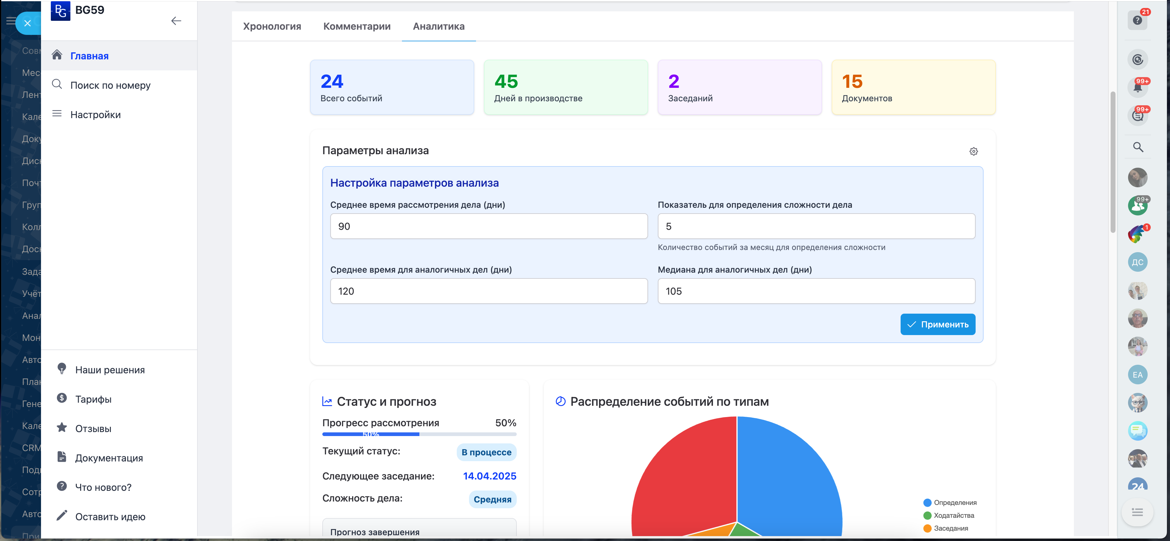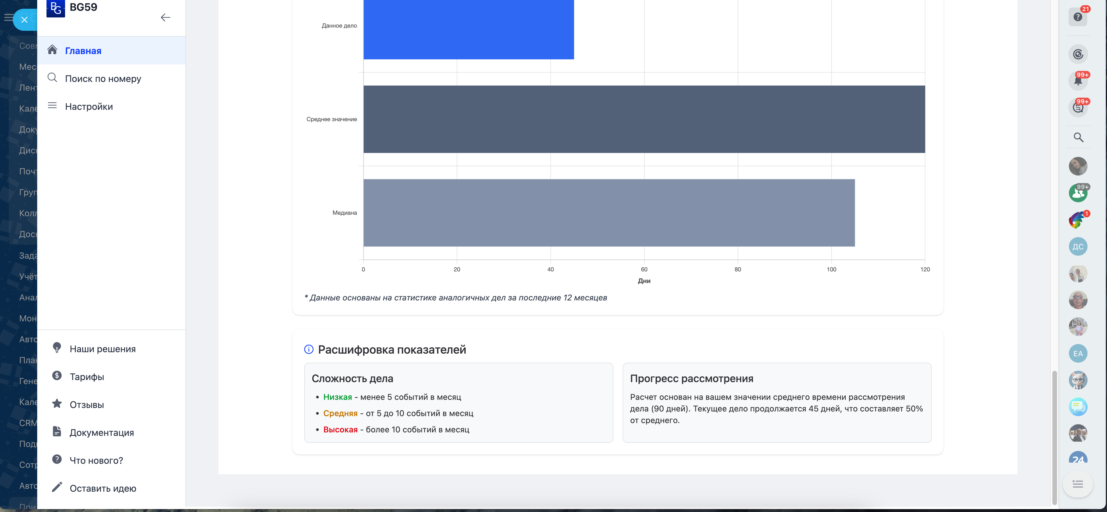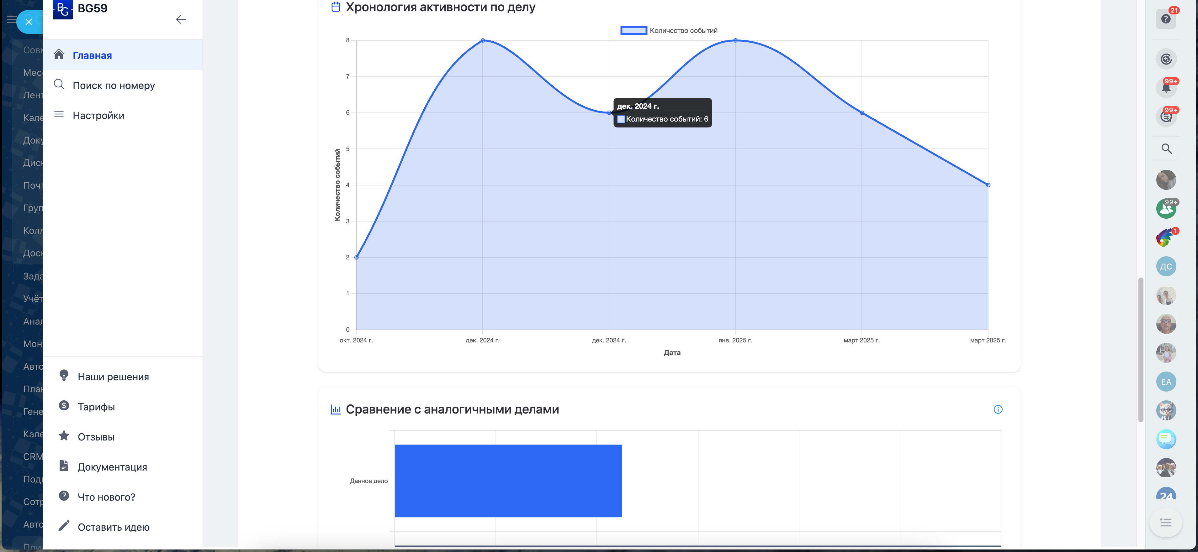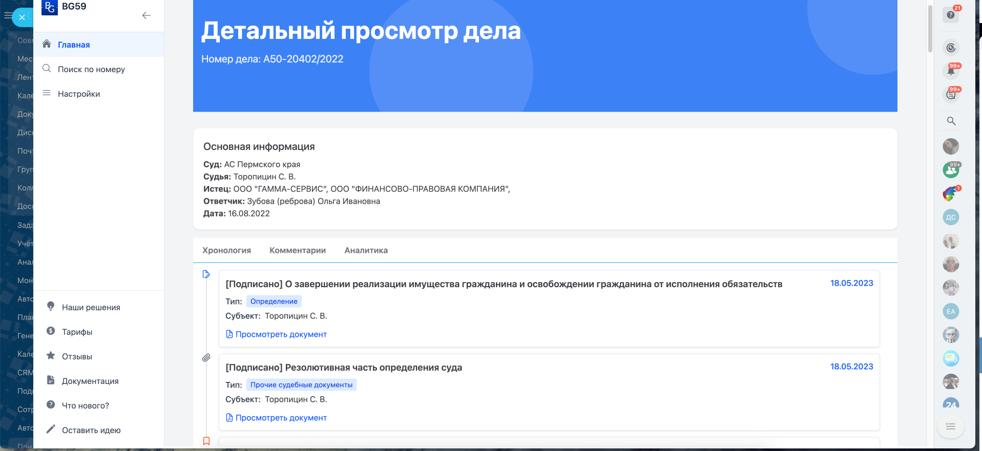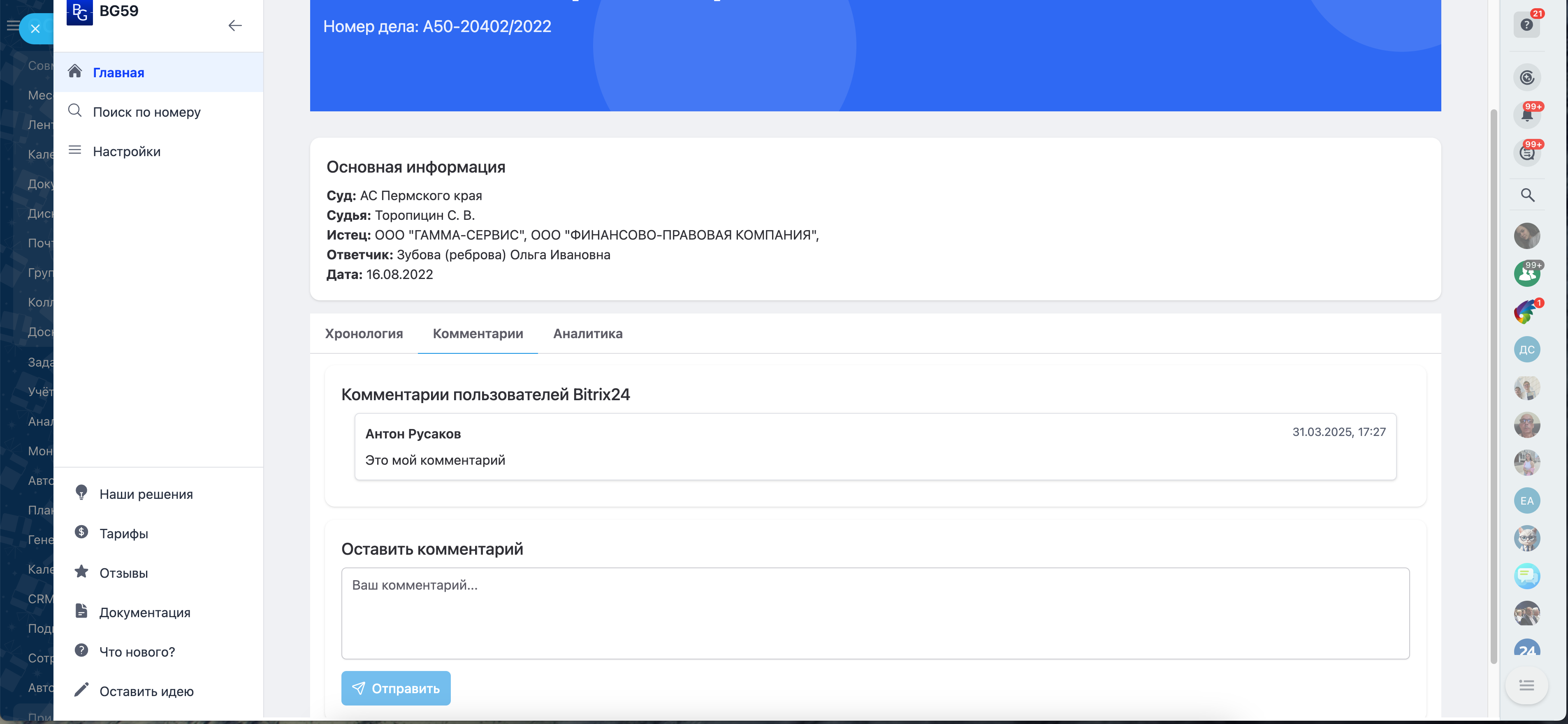 После ввода ИНН и получения списка дел вы можете нажать на номер интересующего дела (функция доступна на тарифе «Профессионал» и выше). Откроется карточка с полной информацией о деле, где вы также можете оставить собственный комментарий — например, чтобы зафиксировать позицию компании, статус общения с контрагентом, результат переговоров или внутренние инструкции для коллег. Здесь же доступна расширенная аналитика по делу.
