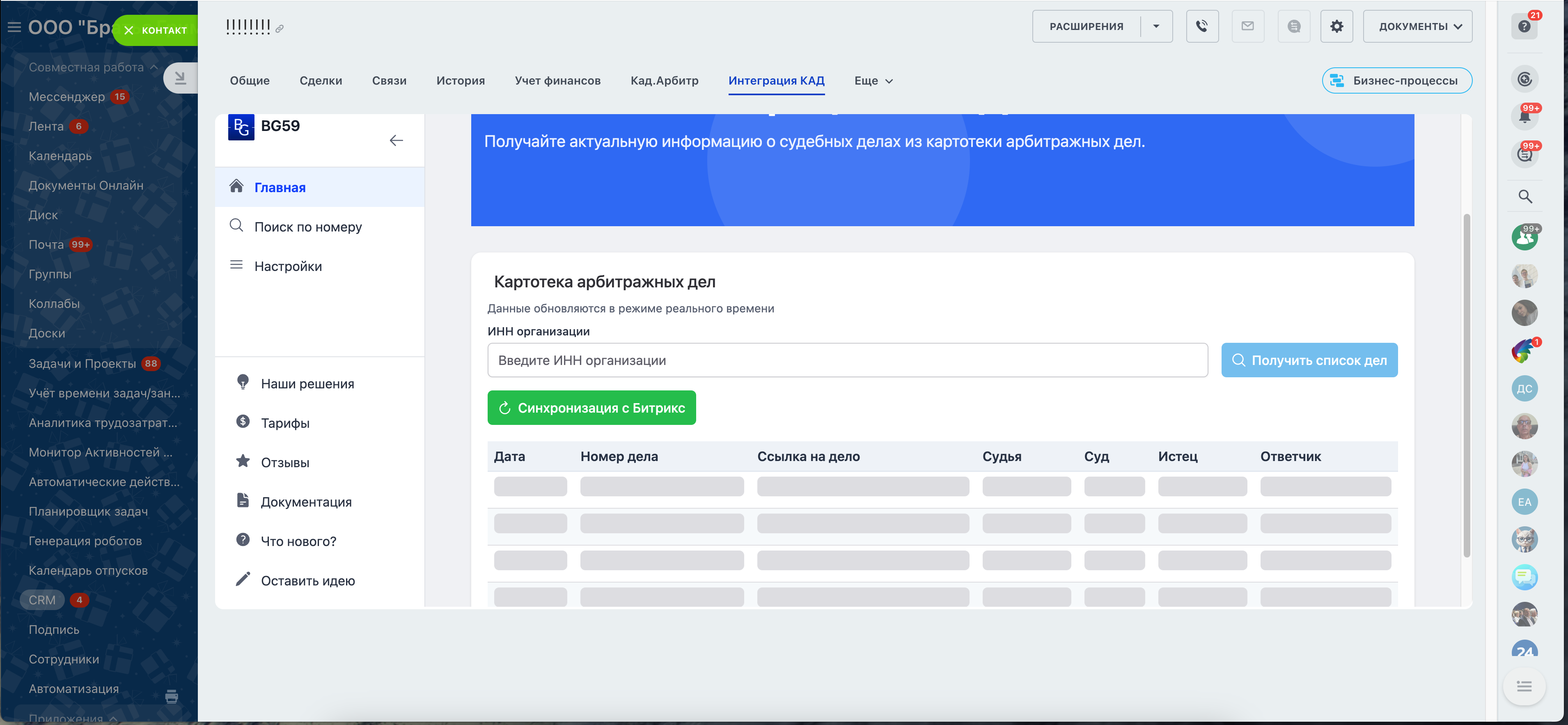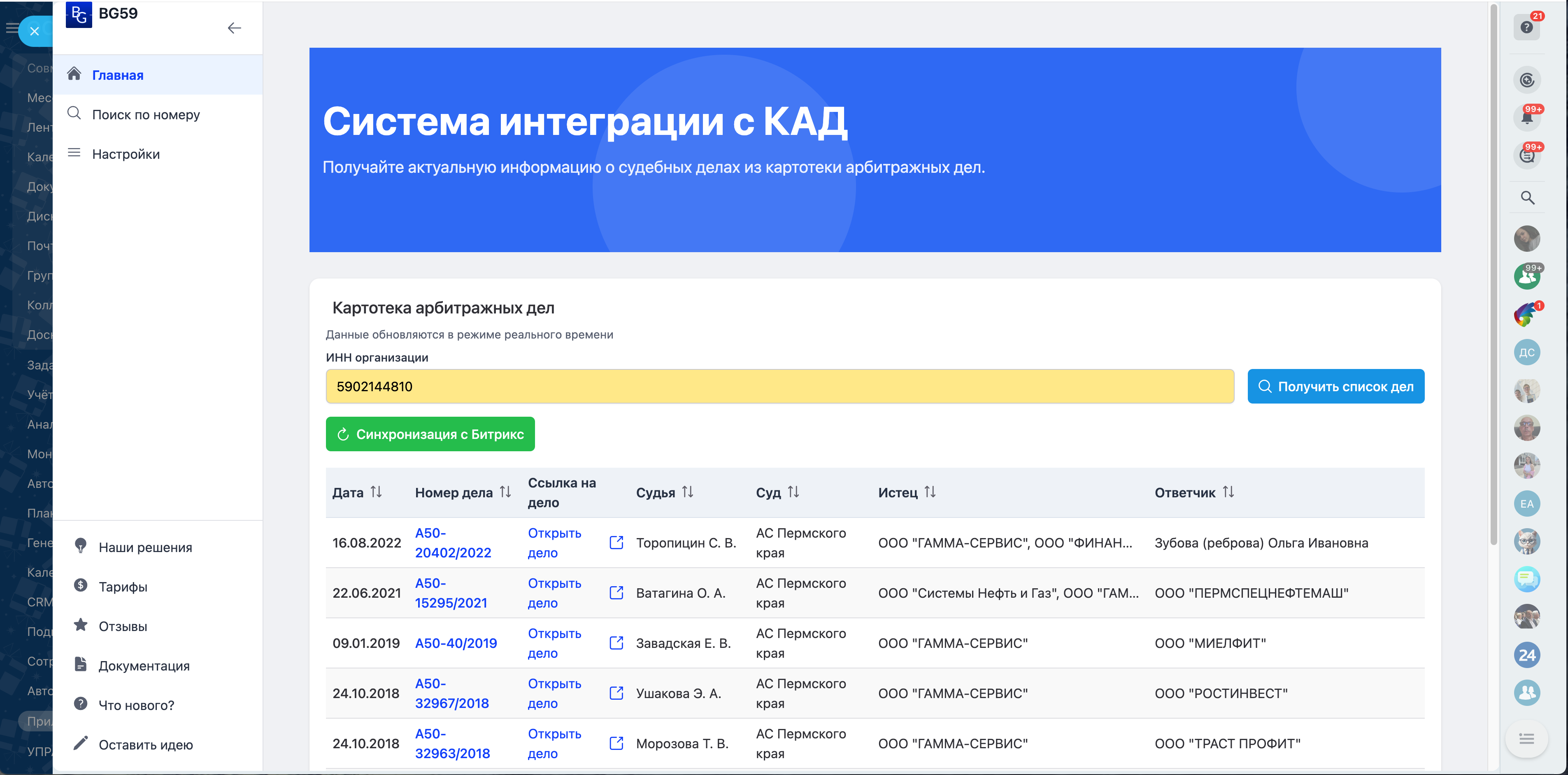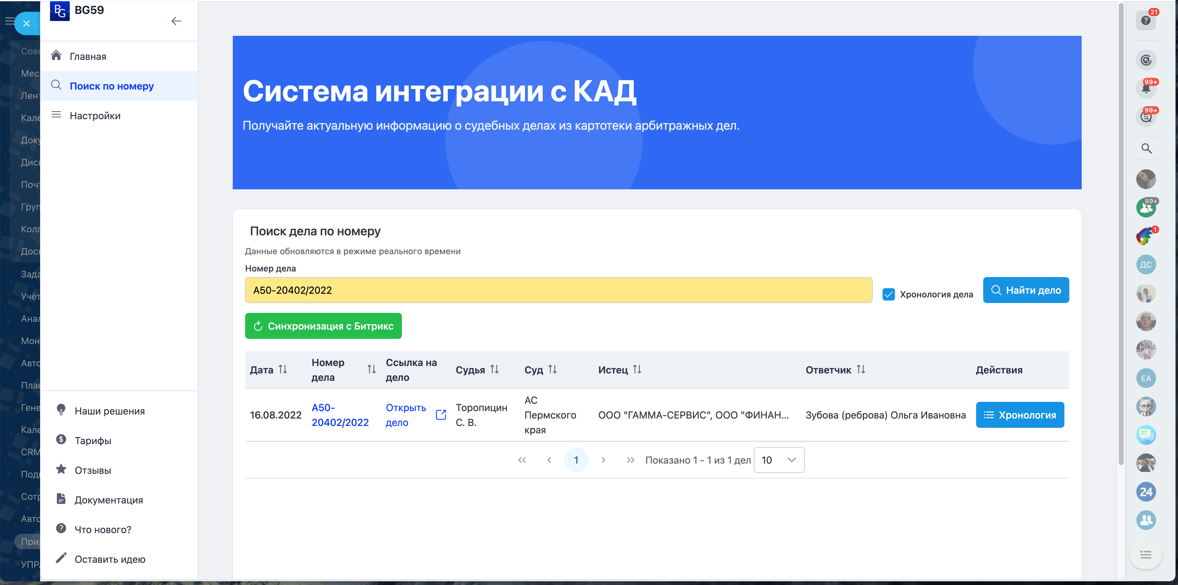 Кнопка синхронизации с Bitrix24 не появляется автоматически — она размещена на странице «Главная», где осуществляется поиск дел по ИНН, а также на странице «Поиск по делу». После выбора нужной сущности и нажатия кнопки происходит синхронизация, в рамках которой в таймлайне CRM-сущностей появляются комментарии с информацией из найденных судебных дел.