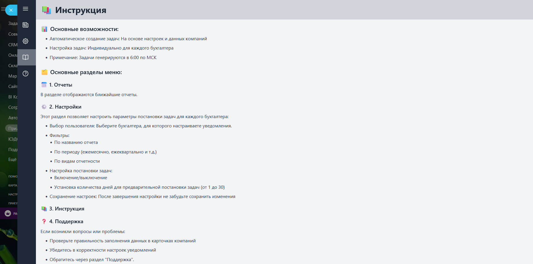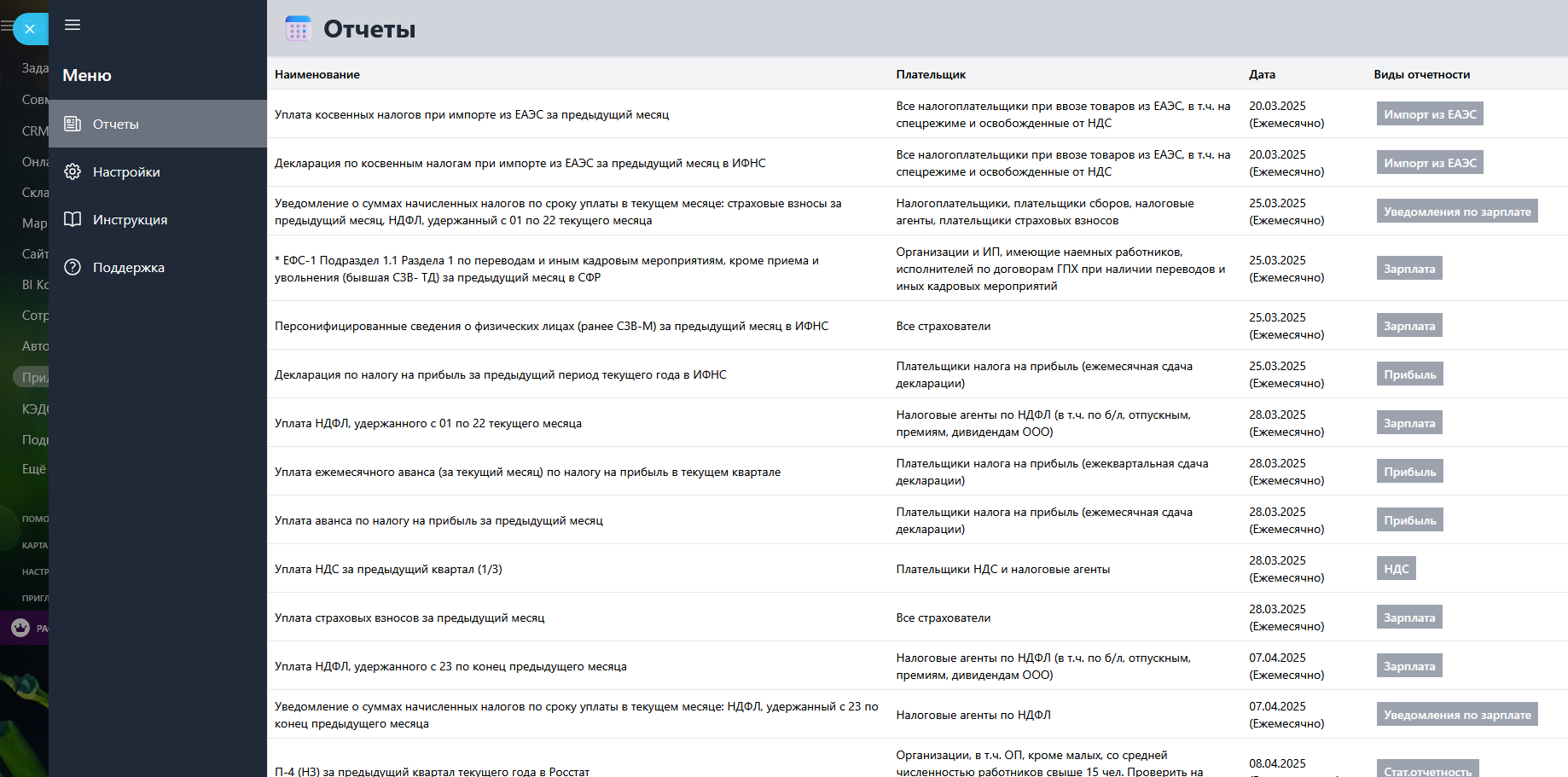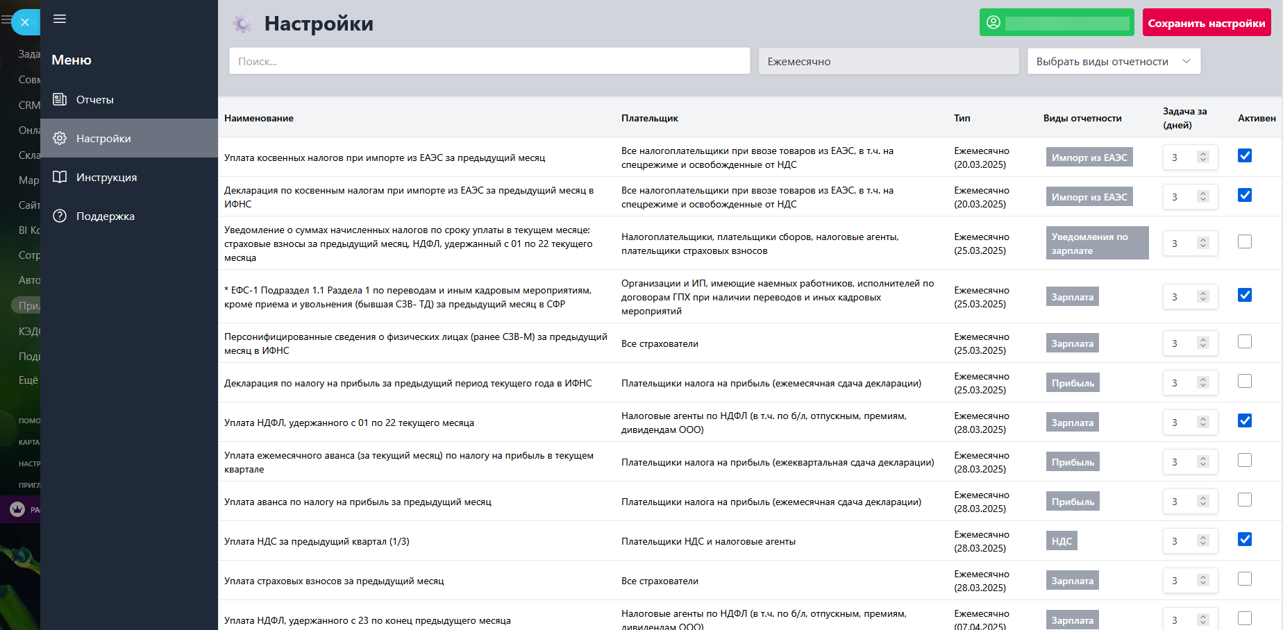 - Гибкие настройки: Каждый бухгалтер может настроить параметры под свои потребности: выбрать периодичность, типы отчётов и количество дней для напоминания.