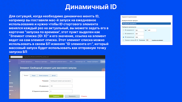 - Возможность выбора среза объектов по их ID и дополнительно по фильтру полей, что дает возможность запускать процессы только для определенной группы объектов, отфильтрованных по нужным критериям.