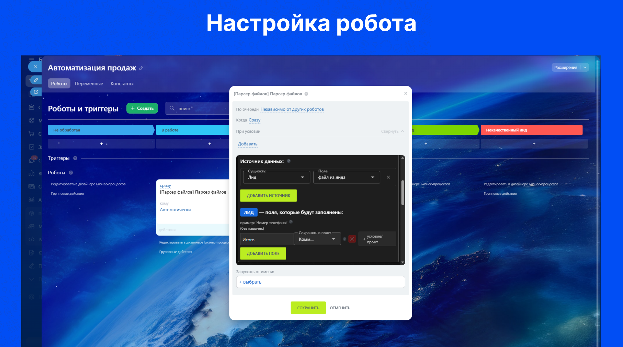 Если у вас есть неразобранные файловые поля в CRM, то менеджеру приходится вручную заносить данные из полей в карточку лида/сделки/контакт или смарт-процесс. Данное решение позволяет автоматизировать этот процесс. Установив приложение, вам будет доступен новый робот «Парсер файлов». Робот может работать с лидами/сделками/контактами/компаниями/смарт-процессами.
