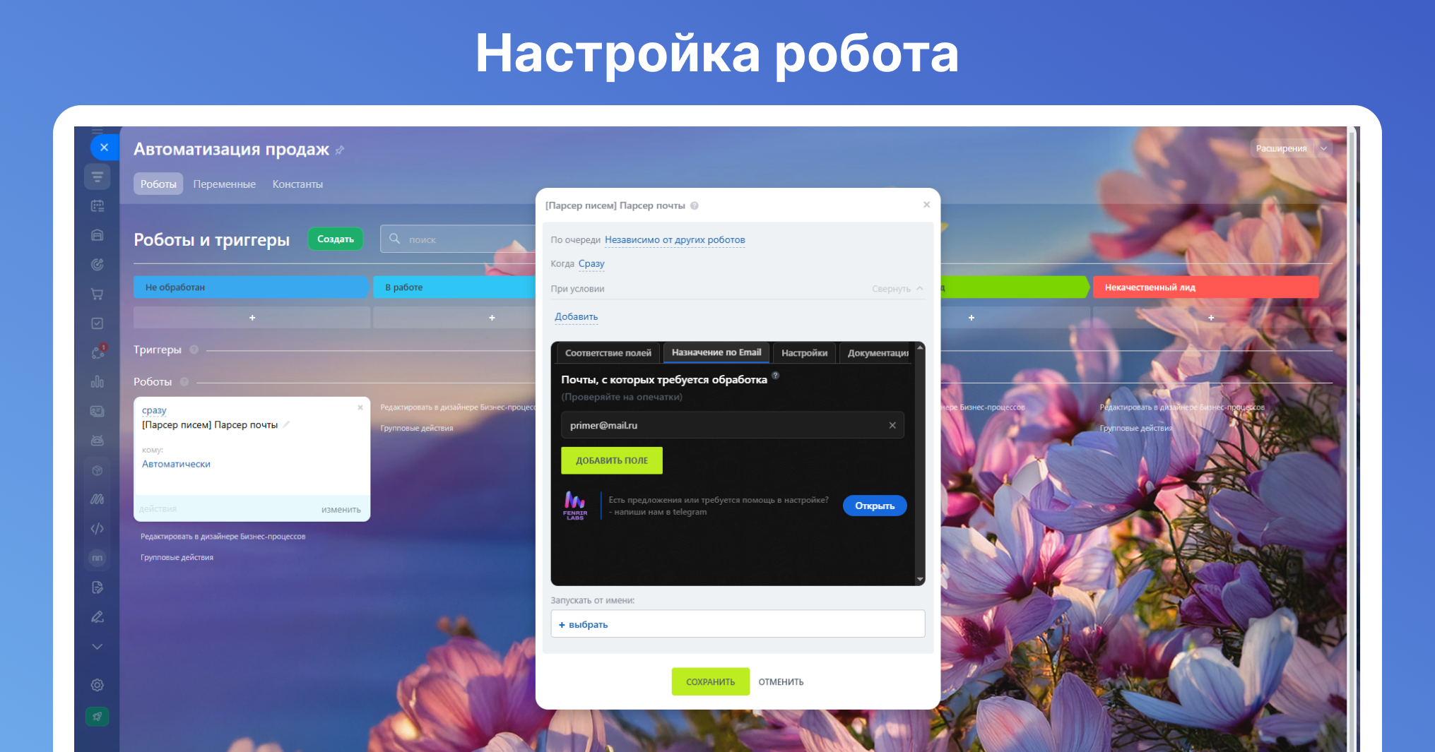 Если на почту поступают письма, с помощью этой настройки можно задать, какое слово из сообщения будет автоматически размещено в нужном поле карточки лида, контакта, компании или сделки.