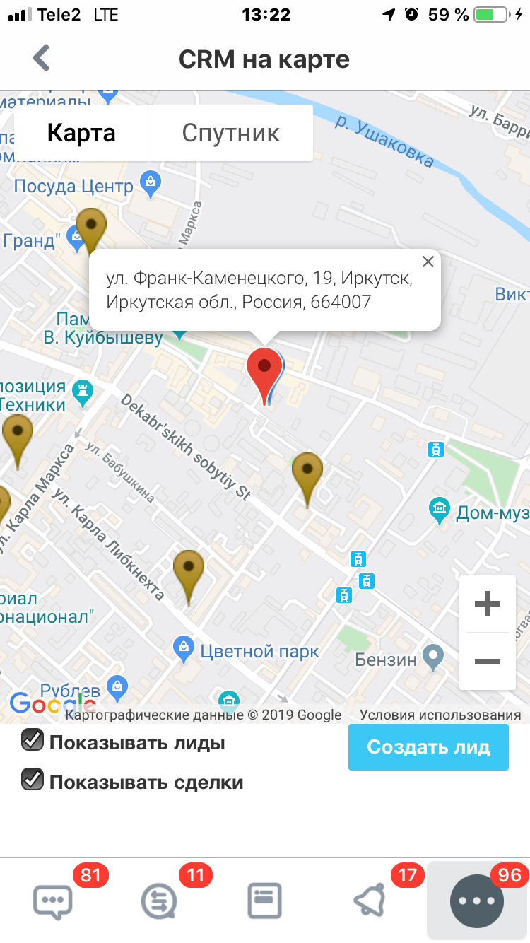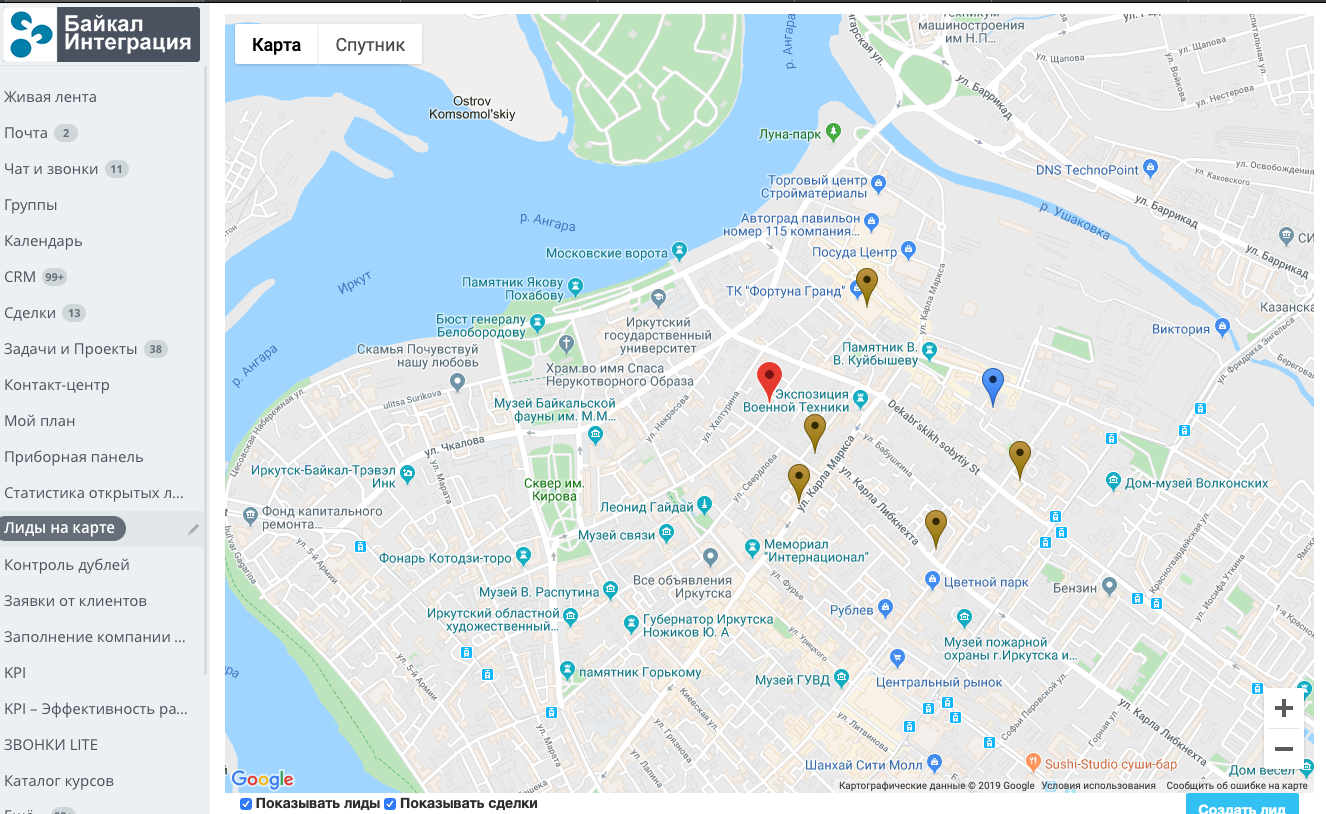 Позволяет создавать Лиды, указывая точку на карте. Отображает на карте лиды и сделки.