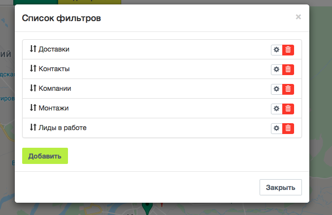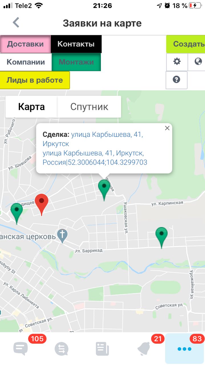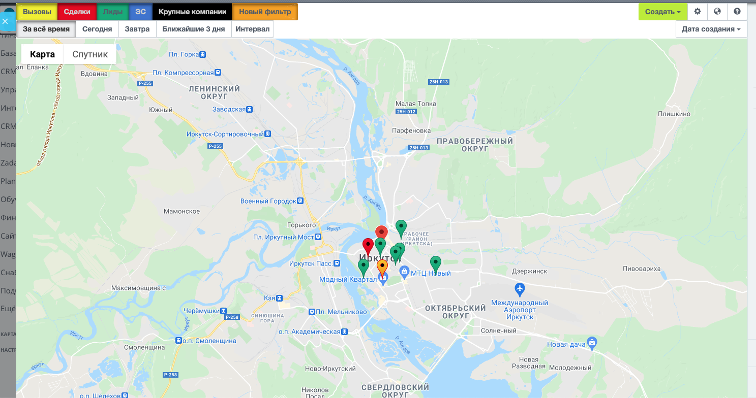 - Отображение и создание лидов, сделок, контактов, компаний, задач прямо на карте