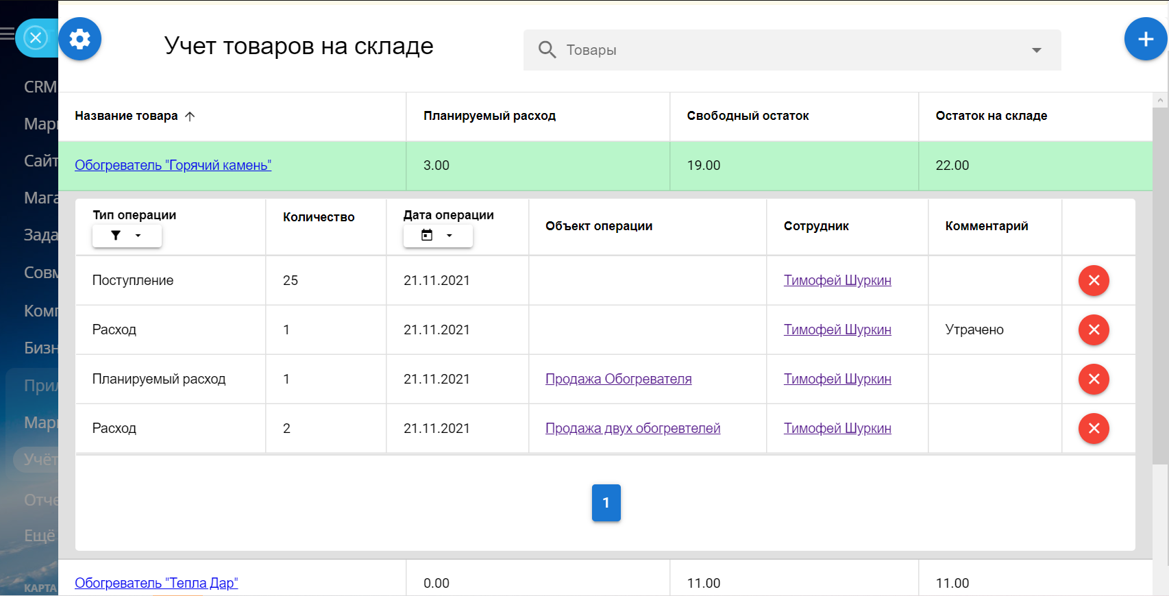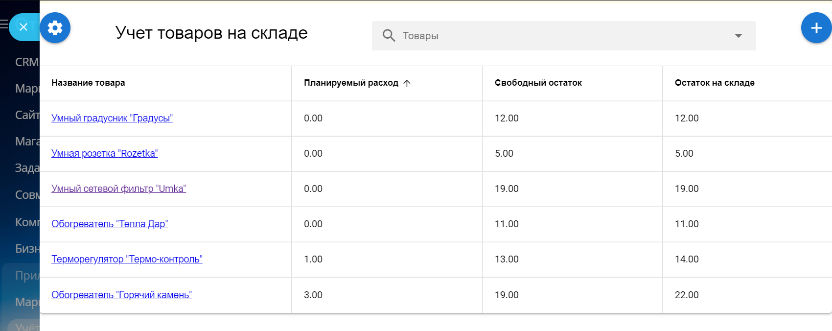- Отслеживание количества товара, находящегося на складе и в сделках в реальном времени
