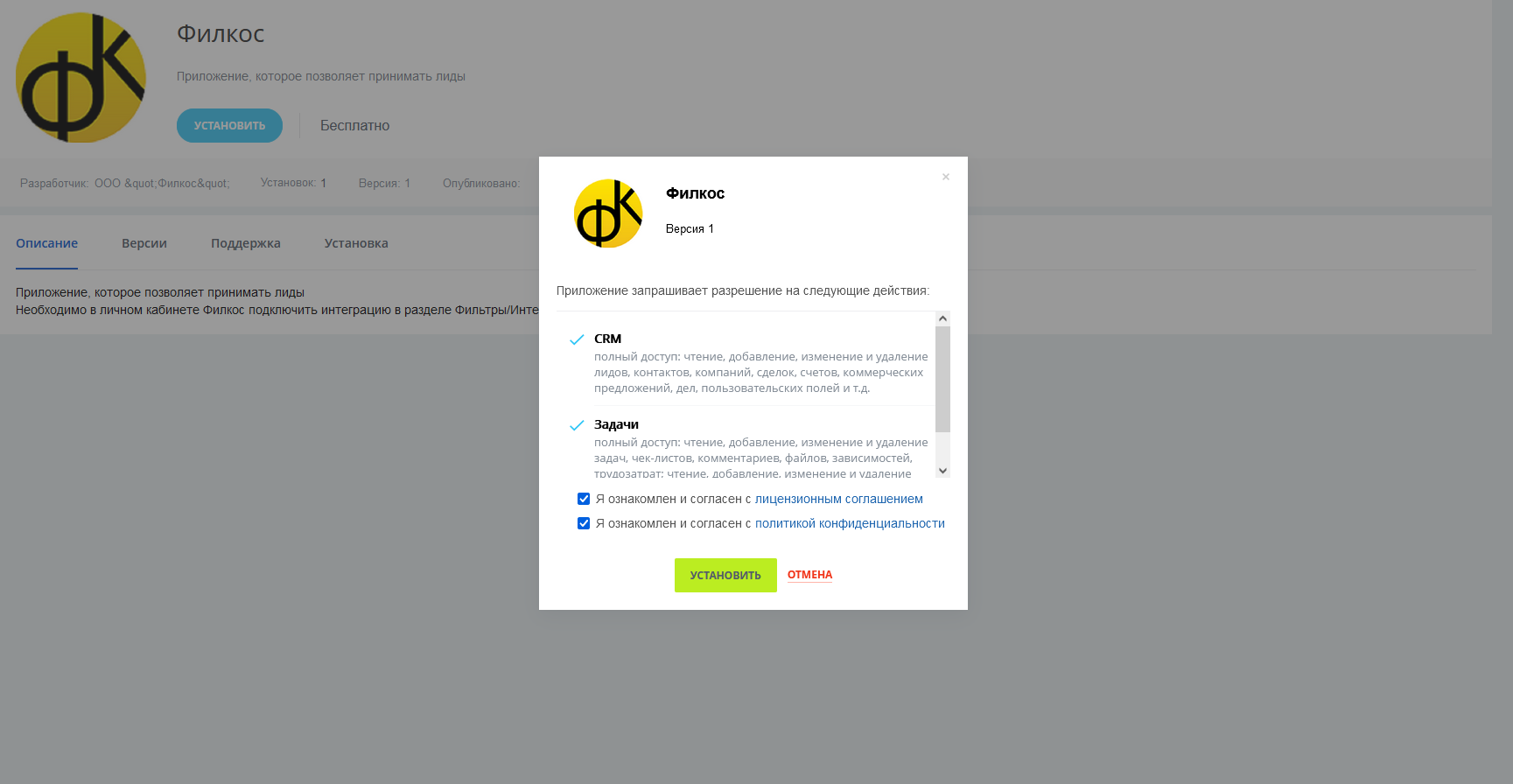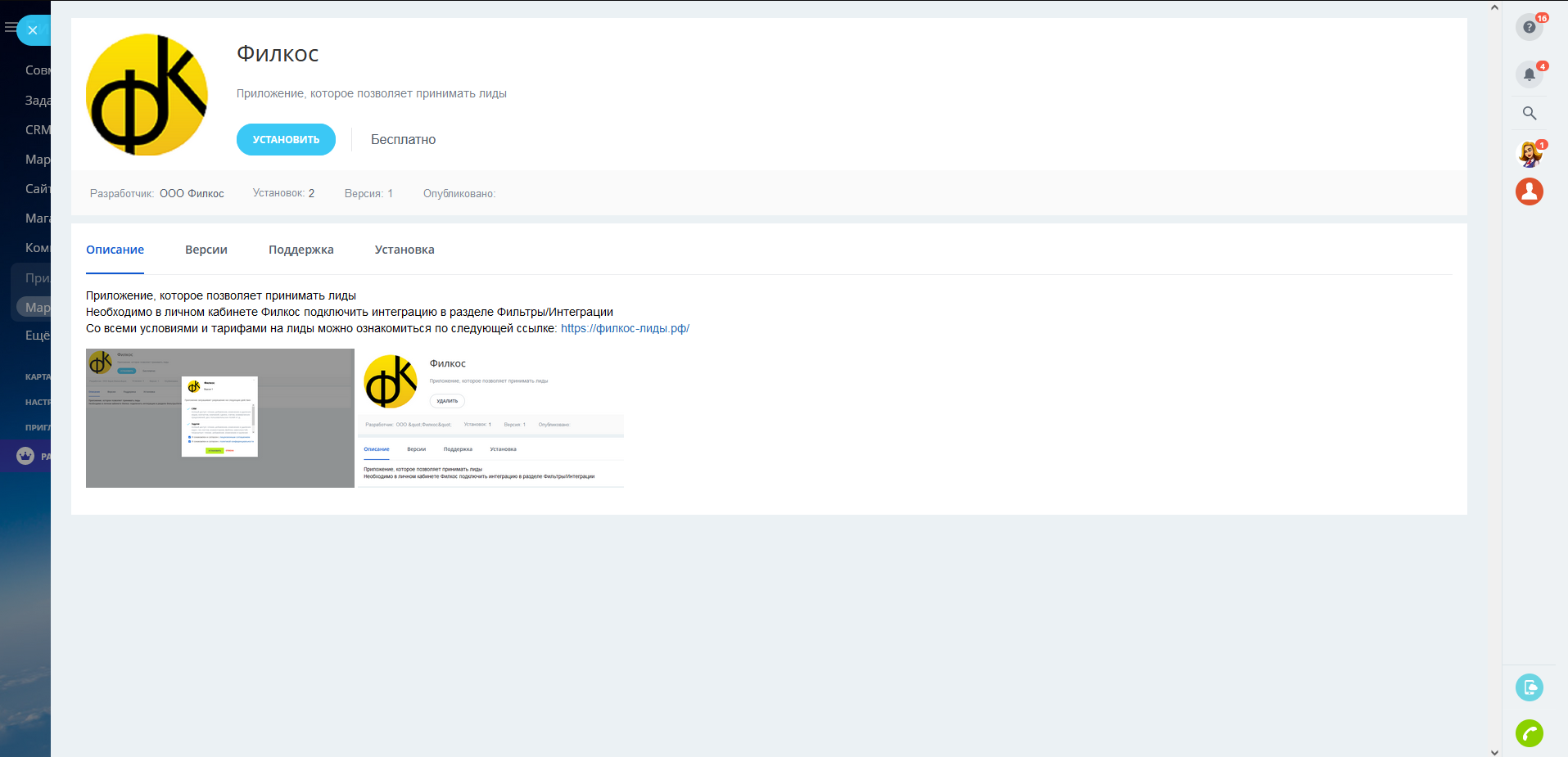 Приложение, которое позволяет принимать лиды из личного кабинета Филкос