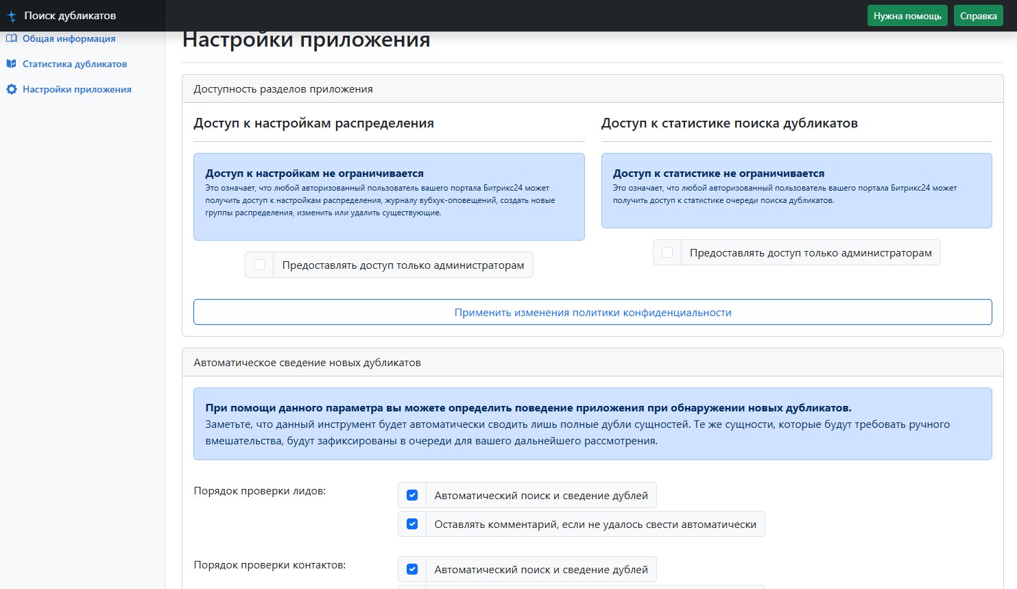 Приложение обеспечивает автоматический поиск и обработку дубликатов среди лидов, контактов и компаний в CRM «Битрикс24».