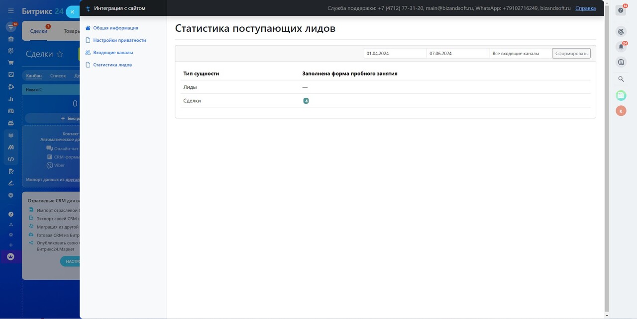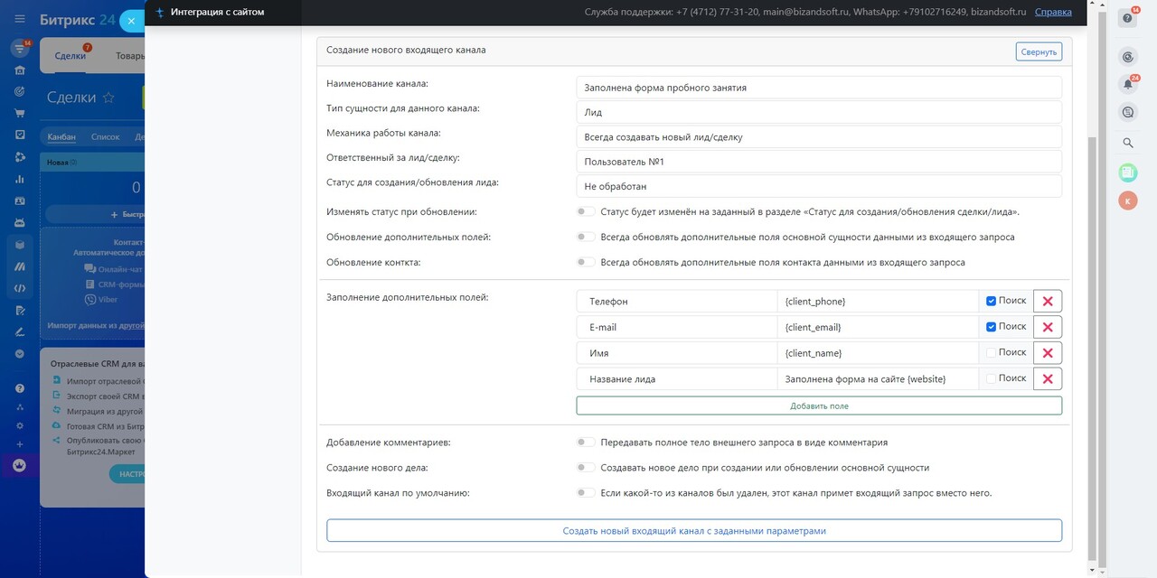 После установки нашего приложения и создания входящего канала вы получите URL обработчика. Теперь достаточно просто снимать данные из формы по клику на кнопку отправки и передавать снятые данные по предоставленному URL. Приложение разберёт переданную информацию, приведёт её в соответствие с заданными настройками входящего канала и создаст по факту данного обращения Лид или Сделку. - Интеграция через webhook