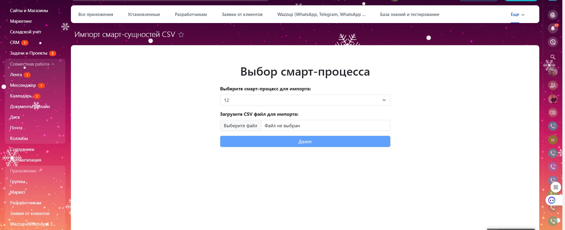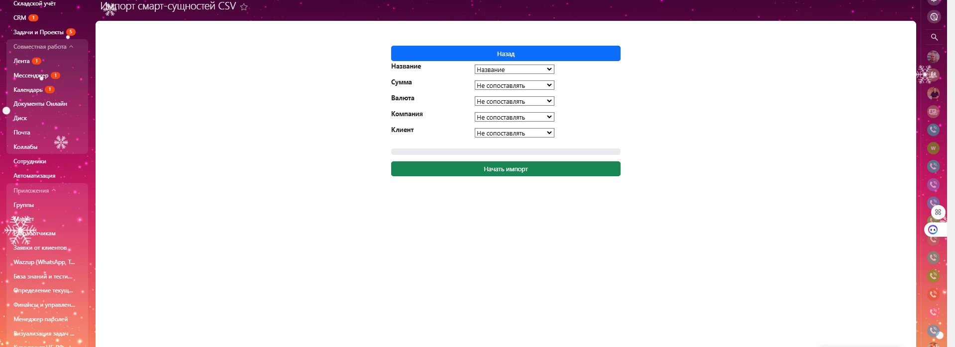 - Импорт данных: Быстрый и эффективный импорт данных в выбранный смарт-процесс.