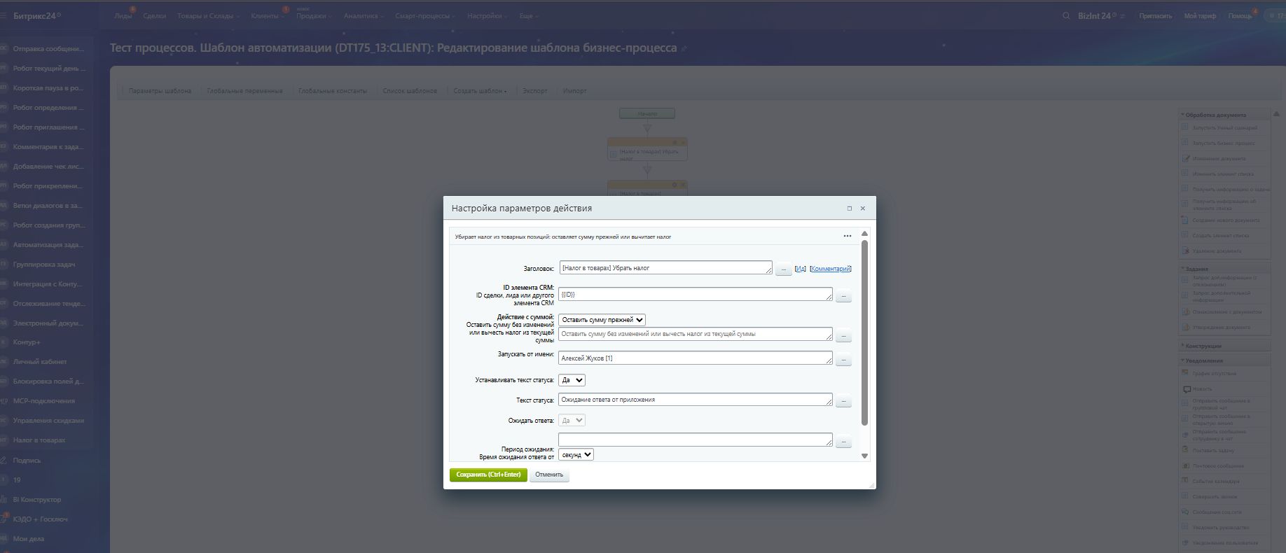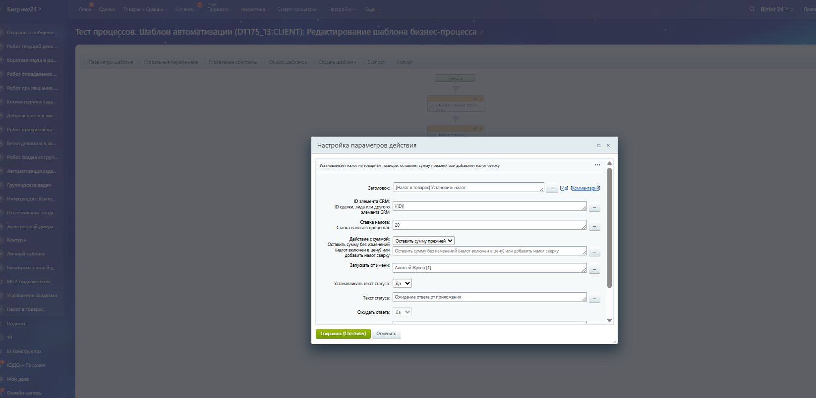 Приложение добавляет двух роботов для автоматического управления налогами в товарных позициях CRM. Работает со сделками, лидами, счетами и смарт-процессами. Роботы умеют добавлять или убирать налог, автоматически создавать ставки НДС и гибко настраивать включение налога в цену. Поддерживает работу как в бизнес-процессах, так и непосредственно в воронках продаж.