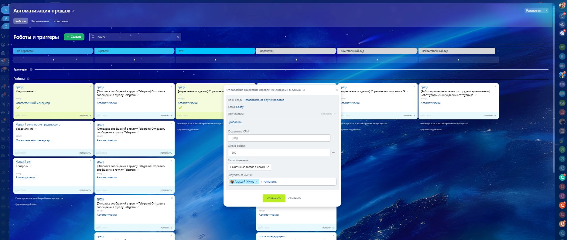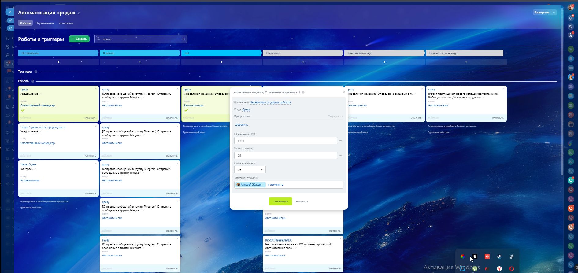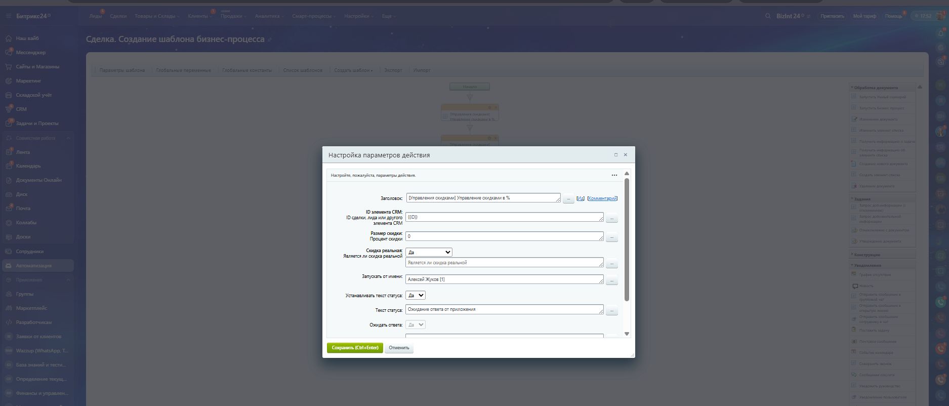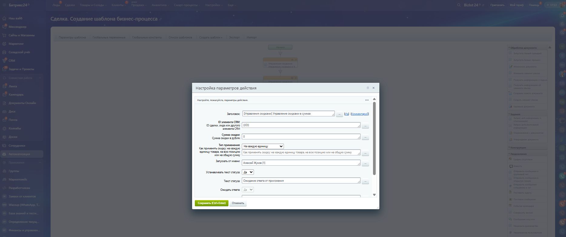 Управление скидками — это приложение для Bitrix24, которое добавляет двух специализированных роботов в бизнес-процессы CRM. Приложение позволяет автоматически применять скидки к товарным позициям в лидах, сделках, счетах и смарт-процессах с высокой степенью гибкости и контролем над типами применения скидок.