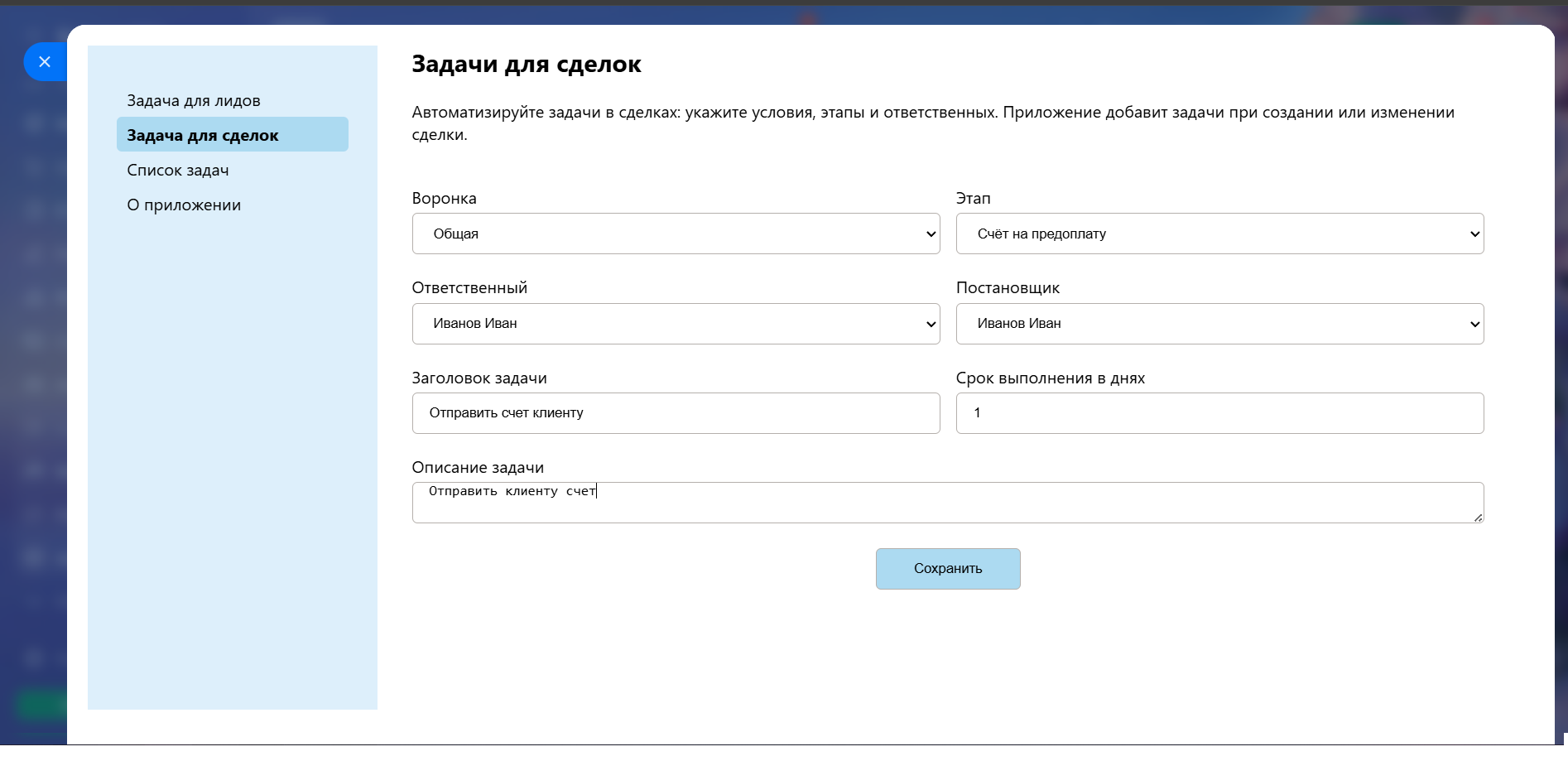 «АвтоЗадачи в сделках» — Ни одной сделки без задачи! Больше никаких забытых клиентов и ручных проверок — приложение автоматизирует контроль задач, чтобы менеджеры работали системно и эффективно.
