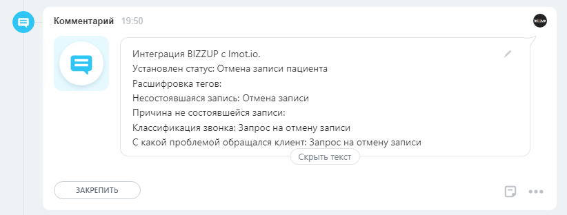 В случае если тег "Статус записи" имеет значение "Запись на приём не состоялась", такие лиды обрабатываются с учетом настроенных правил обработки. Также происходит поиск тегов из "Причины обращения" для заполнения в выбранное поле.