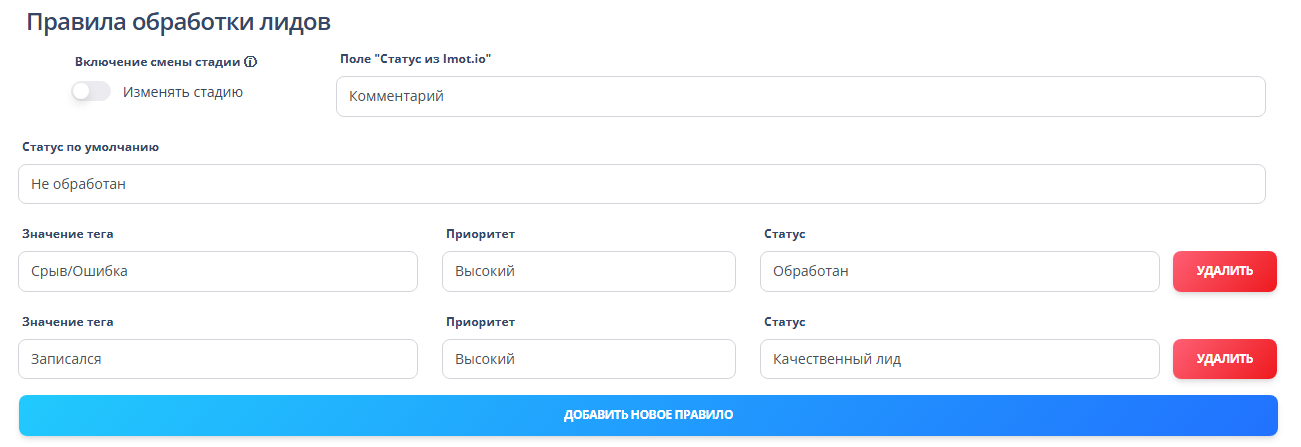 Описание алгоритма обработкиДанные из imot.io с тегами из приоритетов и "Статус записи" и "ID лида" обрабатываются каждый 10 минут.