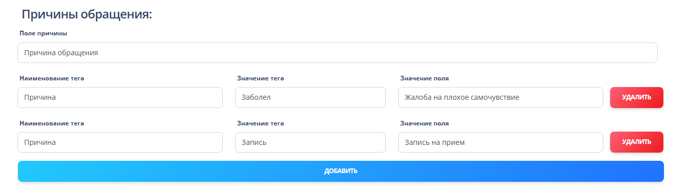 В этом разделе можно настроить причины обращения клиентов, которые будут использоваться для поиска и обработки лидов.