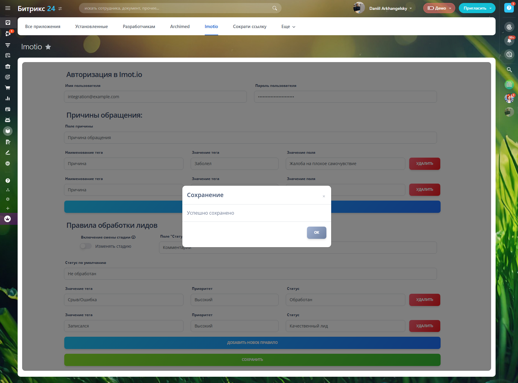 Приложение "Дополнение к интеграции с IMOT.IO" позволяет автоматически изменять статусы лидов в вашем Bitrix24 на основе данных, полученных из imot.io. Это упрощает процесс обработки лидов и повышает эффективность работы с клиентами.