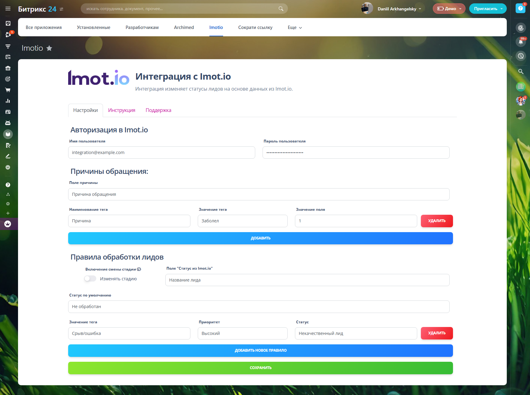 Настройки — для настройки интеграции с Imot.io и правил обработки лидов.