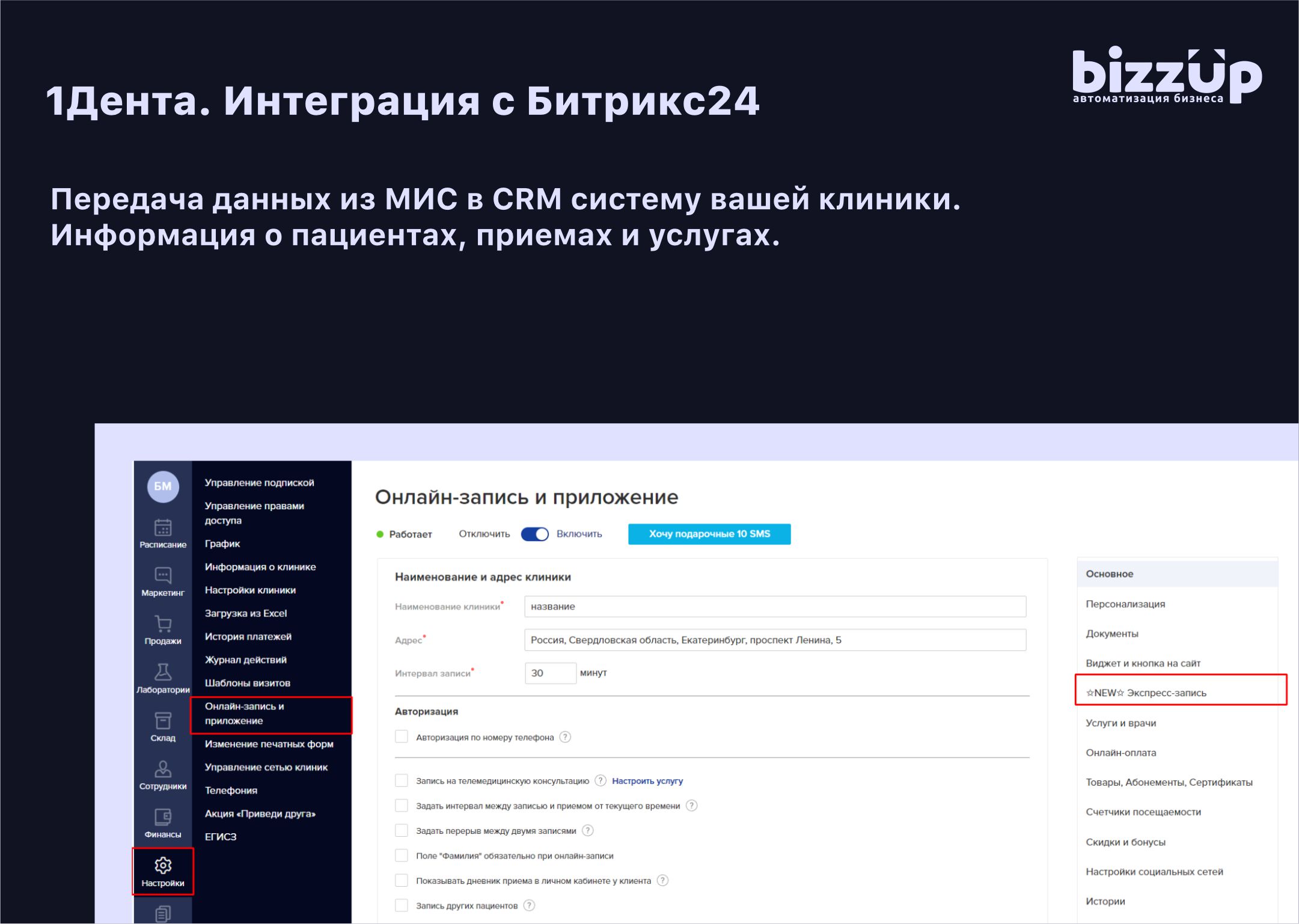 Интеграционный модуль - готовое решение по односторонней интеграции медицинской информационной системы 1Дента и Битрикс24. Передача данных на портал о пациентах, записях на прием, стоимости приема и оказанных услугах с автозакрытием лидов, сделок и сохранением данных сквозной аналитики. Это типовое решение с фиксированной логикой отработанное на базе нашего опыта работы с медицинскими клиниками и стоматологиями. Обеспечена совместимость с готовой CRM "Медицина.Ready".