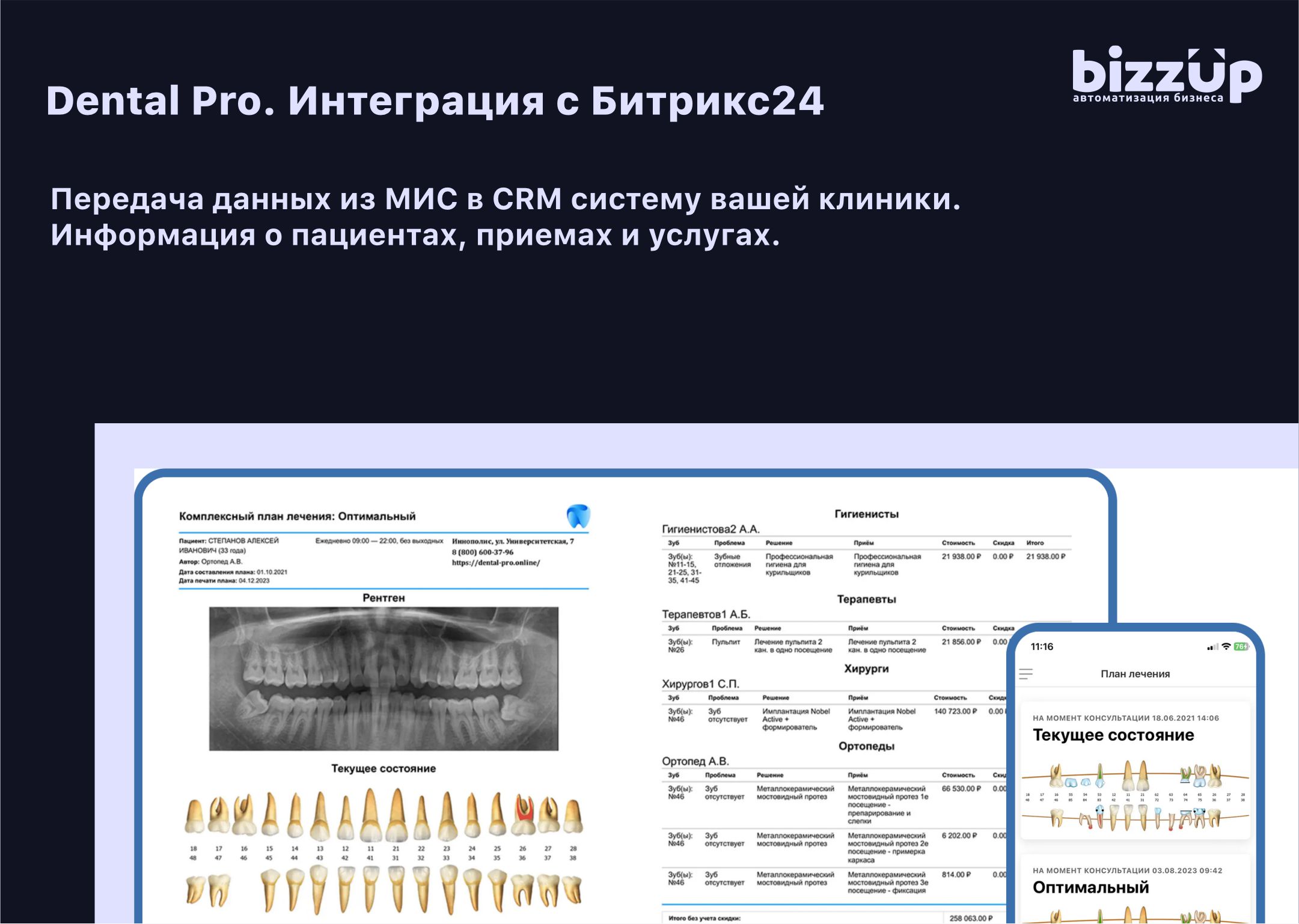 Интеграционный модуль - готовое решение по односторонней интеграции медицинской информационной системы Dental Pro и Битрикс24. Передача данных на портал о пациентах, записях на прием, стоимости приема и оказанных услугах с автозакрытием лидов, сделок и сохранением данных сквозной аналитики. Это типовое решение с фиксированной логикой отработанное на базе нашего опыта работы с медицинскими клиниками и стоматологиями. Обеспечена совместимость с готовой CRM "Медицина.Ready".