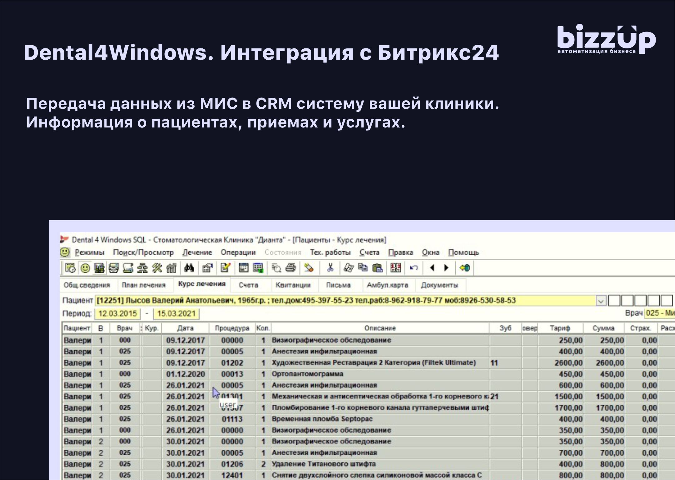 Интеграционный модуль - готовое решение по односторонней интеграции медицинской стоматологической информационной системы Dental4Windows и Битрикс24. Передача данных на портал о пациентах, записях на прием, стоимости приема и оказанных услугах с автозакрытием лидов, сделок и сохранением данных сквозной аналитики. Это типовое решение с фиксированной логикой отработанное на базе нашего опыта работы с медицинскими клиниками и стоматологиями. Обеспечена совместимость с готовой CRM "Медицина.Ready".