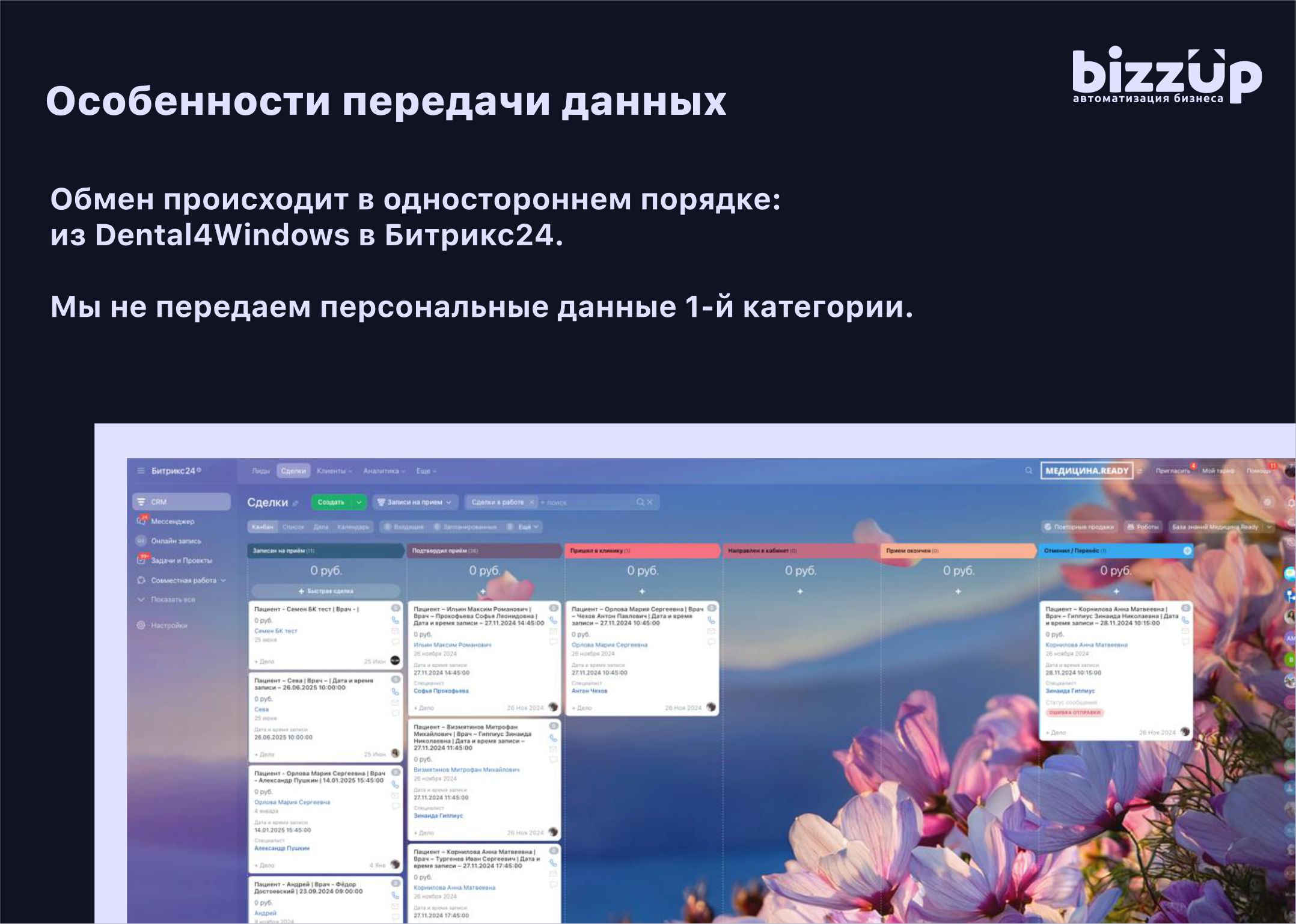 Контактная информация пациента передается в Битрикс24 (мы не передаем персональные данные первой категории), если пациент пришел к нам впервые. Также закрывается лид, который был создан при звонке пациента с сохранением данных в контакте об источнике лида