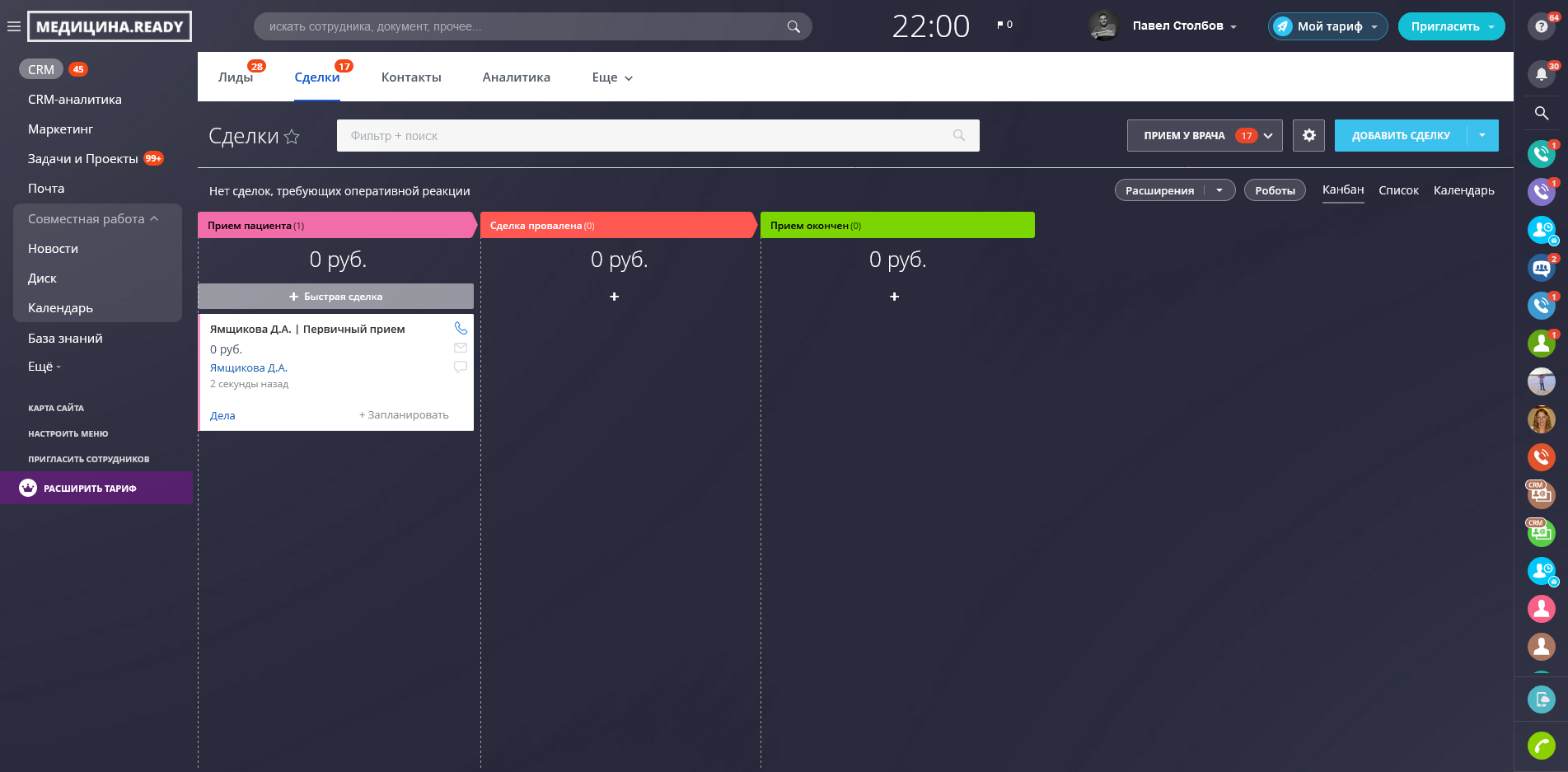 В готовой CRM для Медицинских центров и Стоматологий реализован следующий сценарий работы: