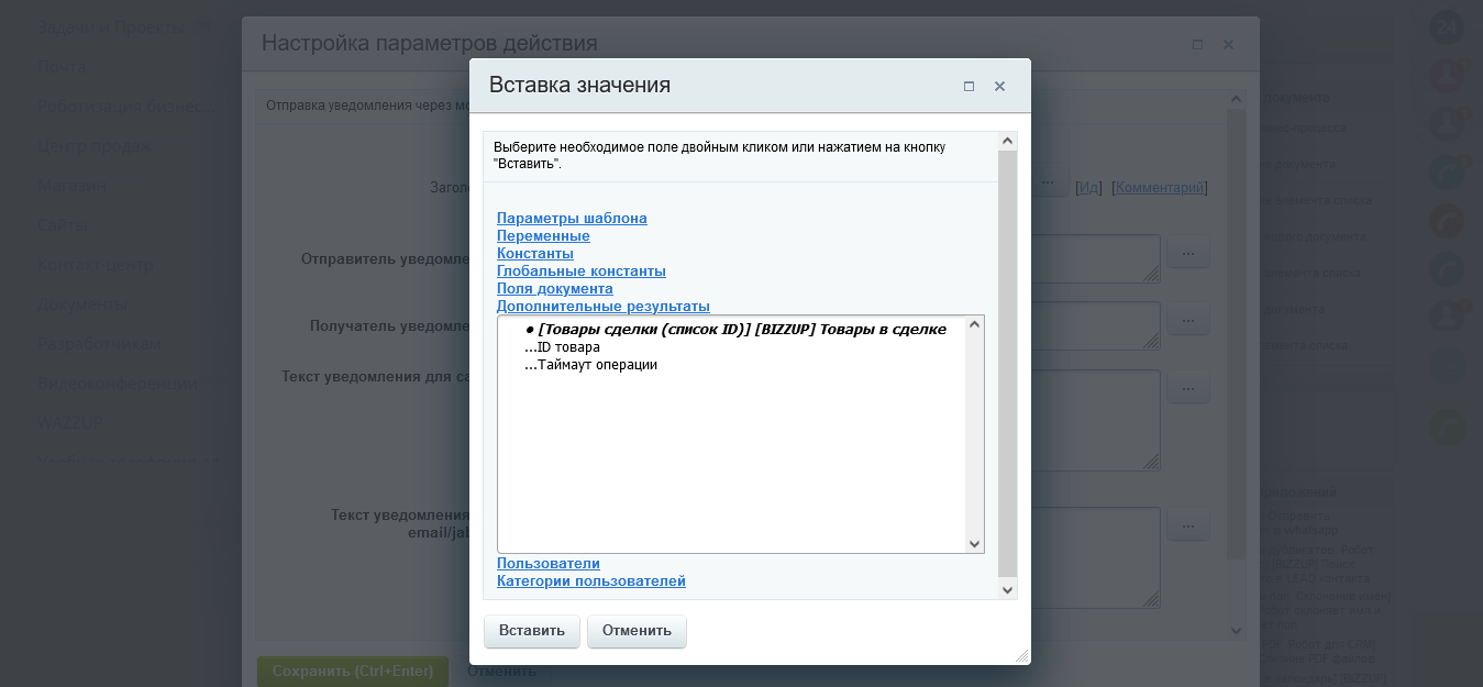 Активити бизнес-процесса получает ID товаров указанной сделки и возвращает их в виде множественного значения в результат действия.