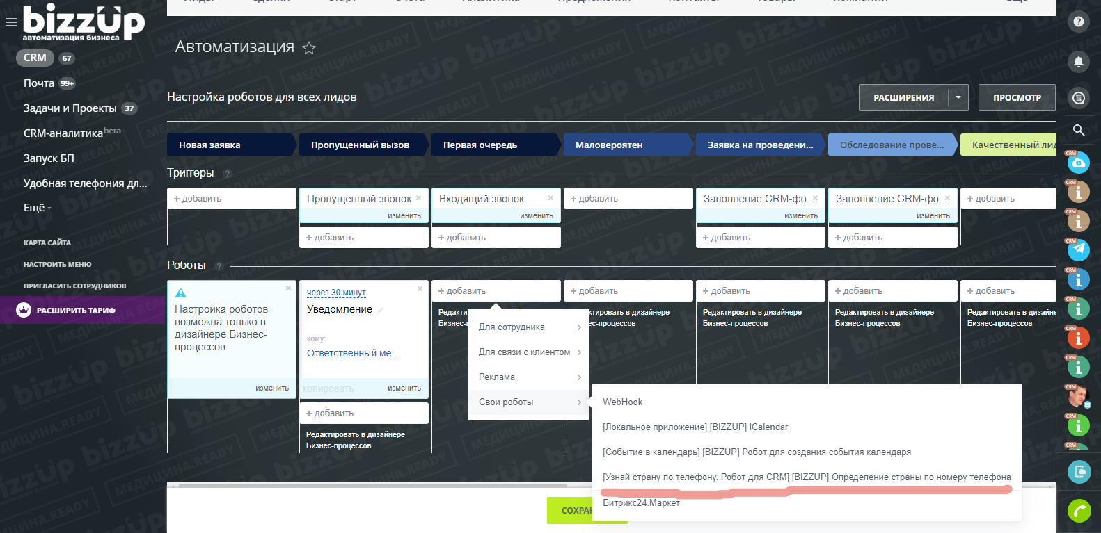 Приложение работает только на тарифах Битрикс24, где доступны роботы и бизнес-процессы.