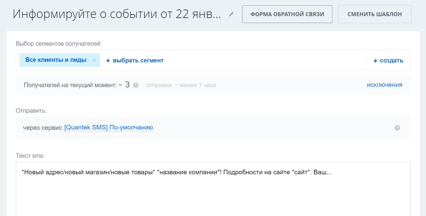 Quantek SMS позволяет отправлять смс из карточки клиента, бизнес-роцессов и CRM роботов.