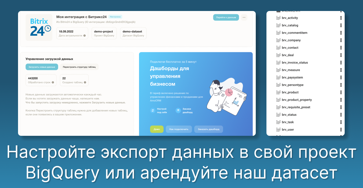 • Настройте интеграцию в течении двух минут. Получите всегда актуальные данные о ваших операциях в BigQuery или ClickHouse в виде таблиц.• Получите готовые функции для работы с данными из Битрикс24, МоегоСклада, amoCRM, YClients, Битрикс24. Используйте готовые SQL запросы для работы с документами, операциями и справочниками, получайте значения пользовательских полей.