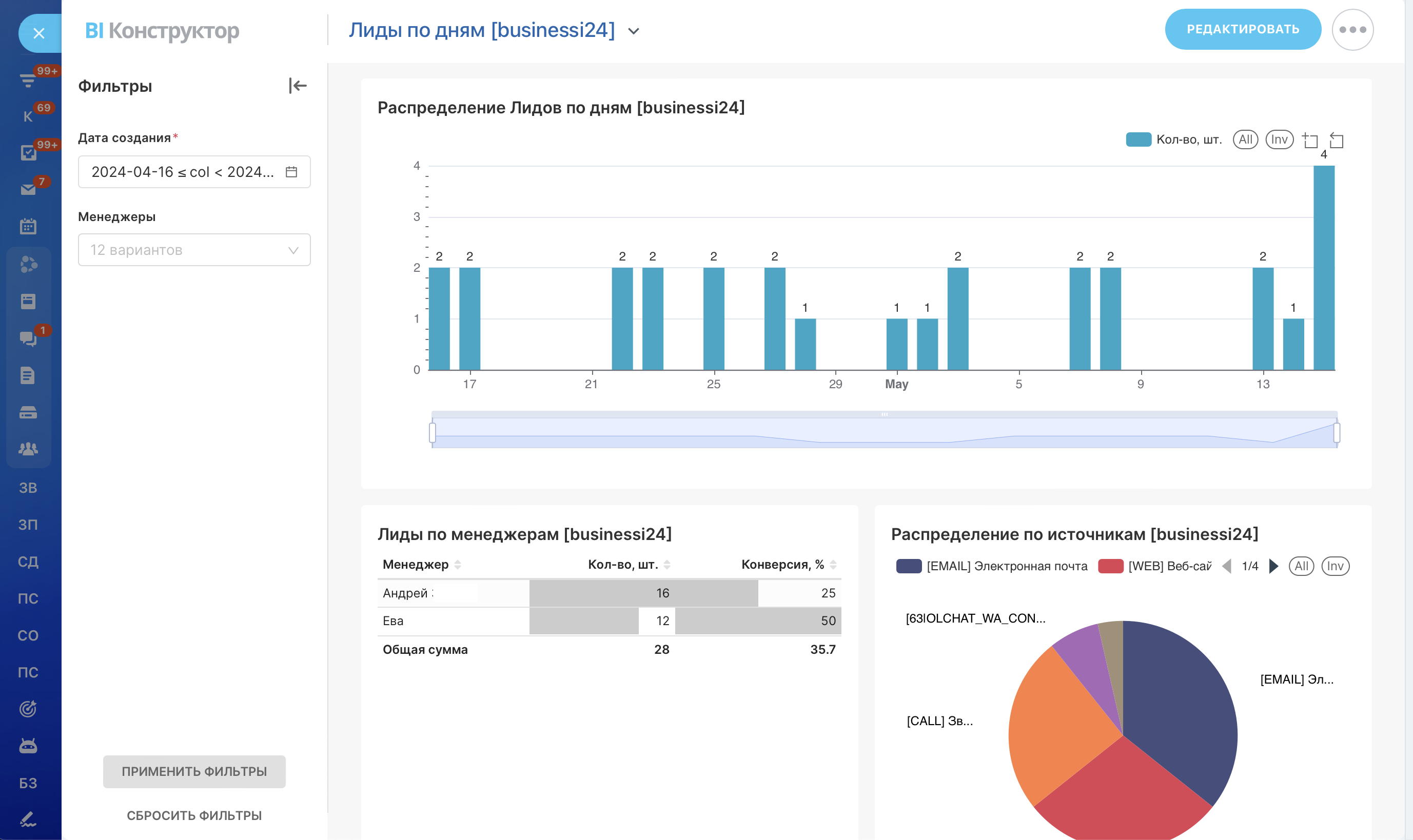 2. Фильтр по менеджерам: Этот фильтр предоставляет возможность анализировать результаты работы каждого менеджера по отдельности. Используя эту функцию, руководители могут точно определить, какие менеджеры наиболее эффективно работают с лидами, кто требует дополнительного обучения или мотивации. Это, в свою очередь, способствует повышению общей производительности команды и улучшению качества обслуживания клиентов.