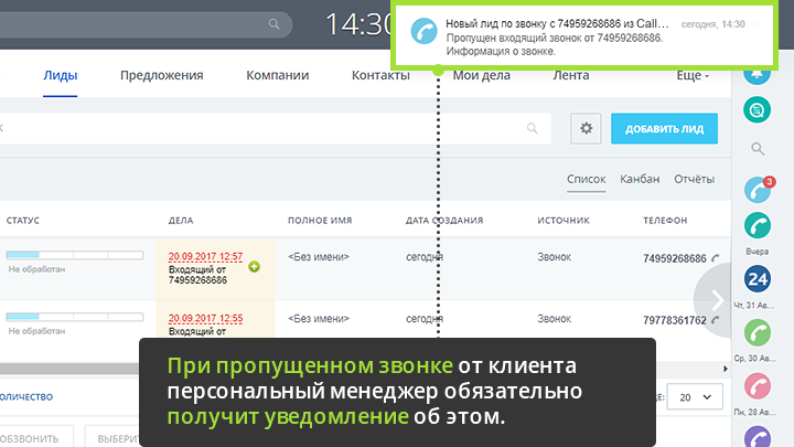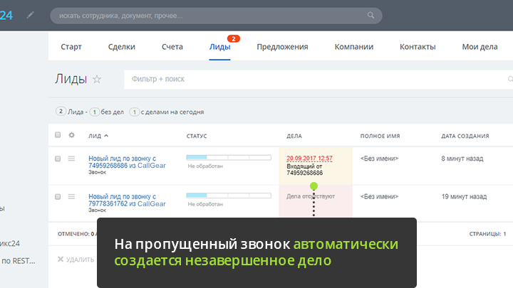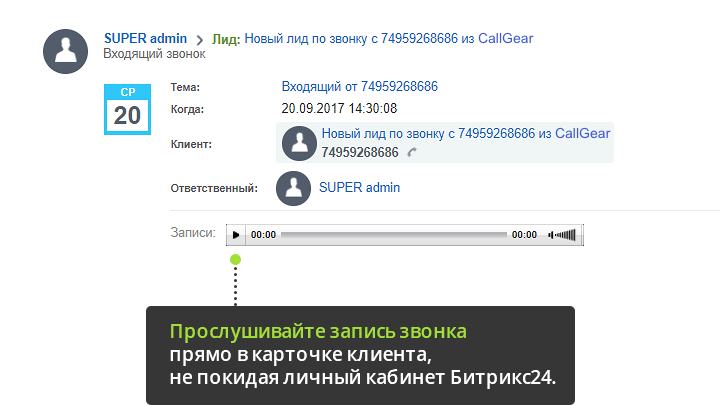 Полезно для отдела продаж и колл-центра: звонки по клику, информация о звонящем и его интересах, автоматическое создание Лида и Дела на первичное обращение, перевод на персонального менеджера, история и контекст предыдущих обращений, прослушивание звонков.
