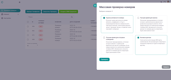 Проверяйте номера телефонов, конвертируете в контакты только актуальные номера. Это повысит результаты ваших маркетинговых и сервисных рассылок. Сократит время на не нужные дозвоны не существующим клиентам.