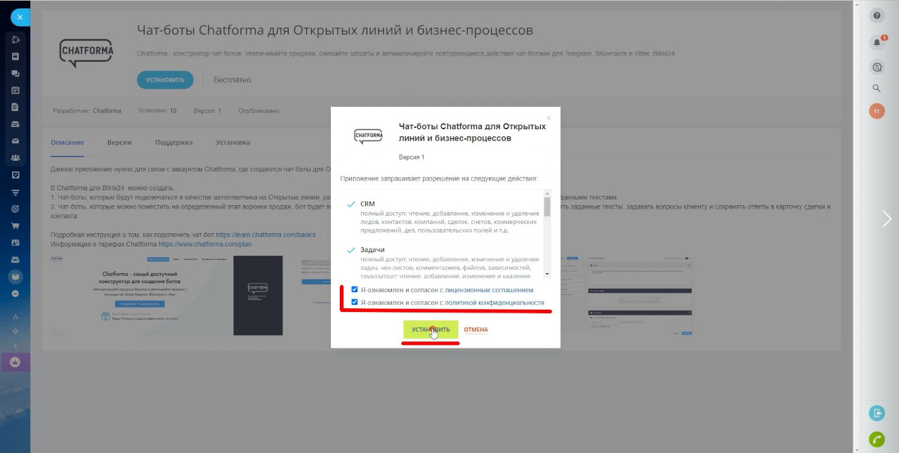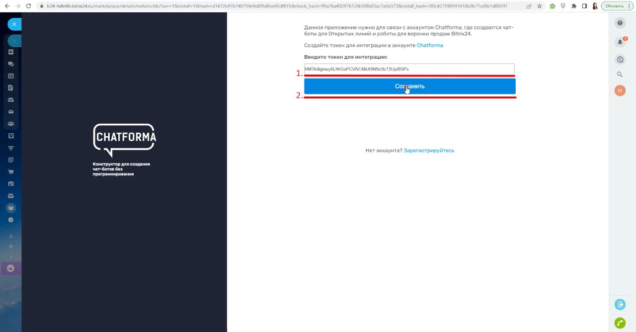 Данное приложение нужно для связи с аккаунтом Chatforma, где создаются чат-боты для Открытых линий и роботы для воронки продаж Bitrix24.