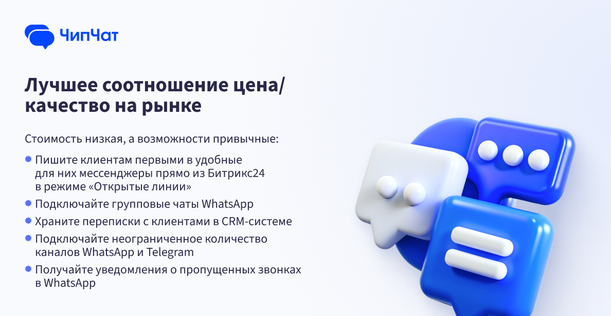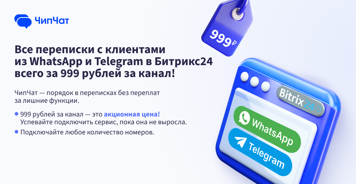 ЧипЧат — сервис интеграции WhatsApp и Telegram с Битрикс24 всего за 999 рублей в месяц.