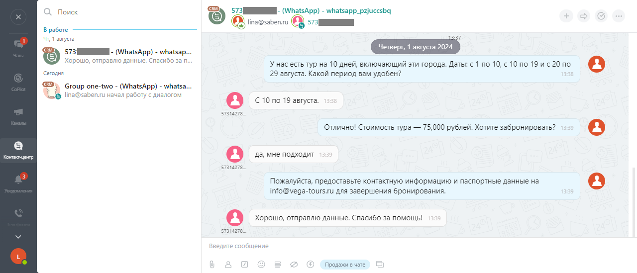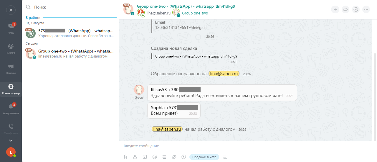 Быстро отвечать клиентам. Переписки с клиентом, который пишет вам из разных мессенджеров, попадают в одну сделку. Любой менеджер может подключиться к сделке и продолжить с ним диалог.
