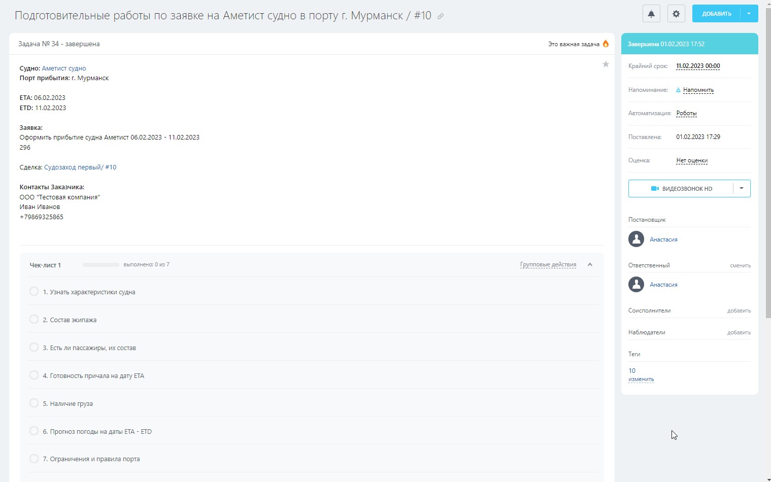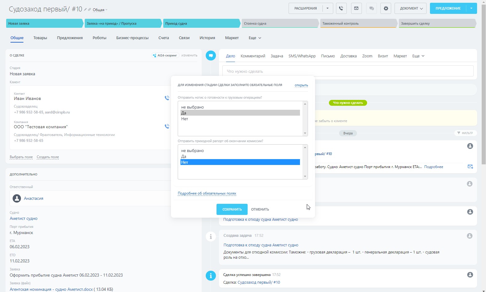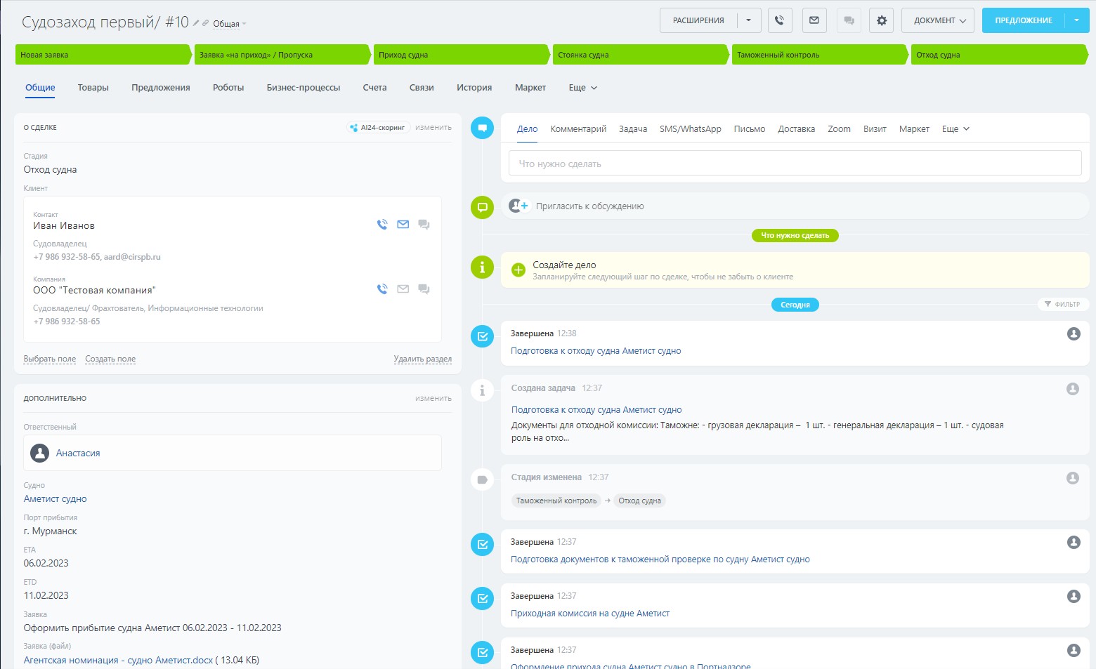 - Судно - это не просто контакт, это важная сущность в работе судового агента. В карточке Судна настроены пользовательские поля IMO и MMSI, помогающие точнее их идентифицировать.