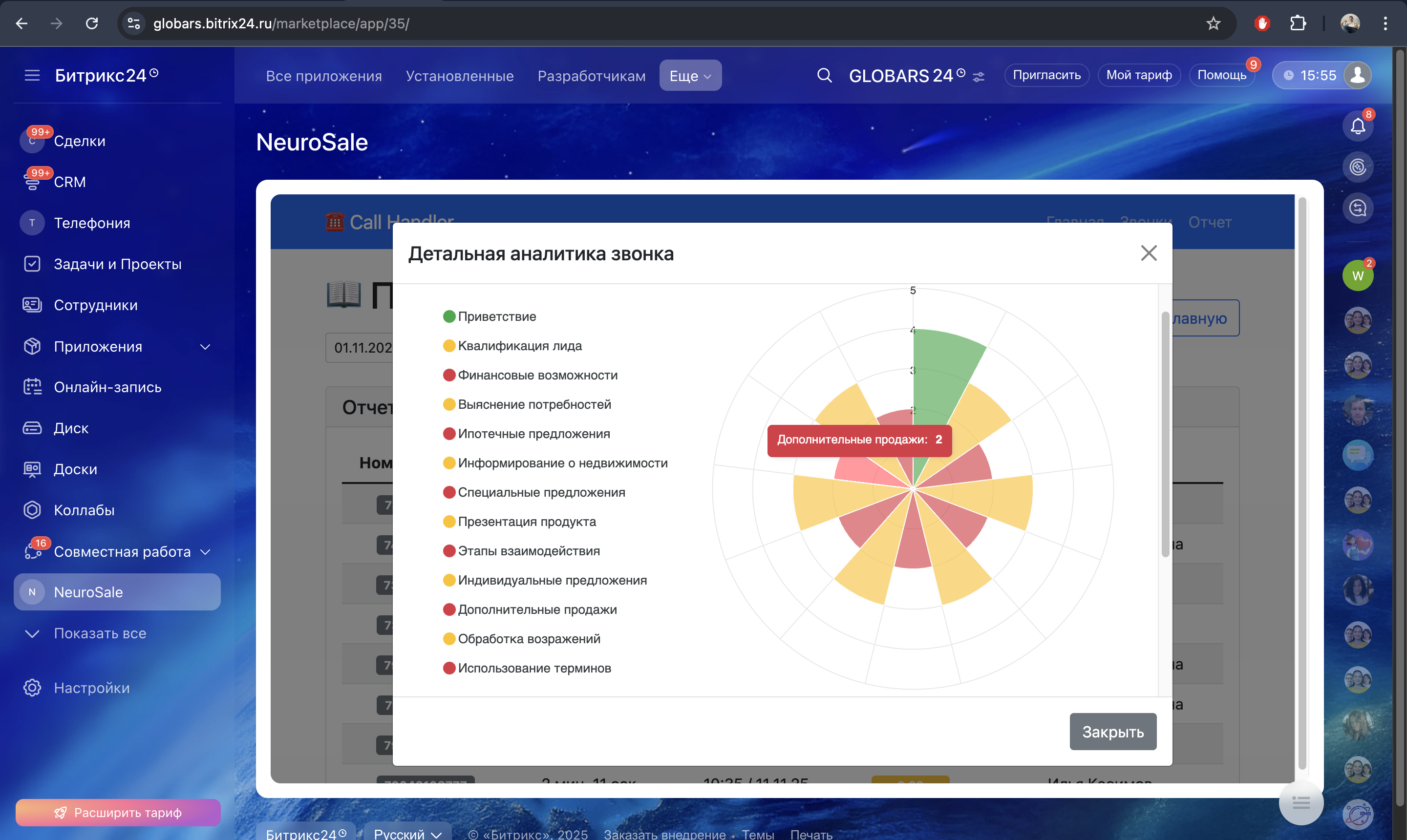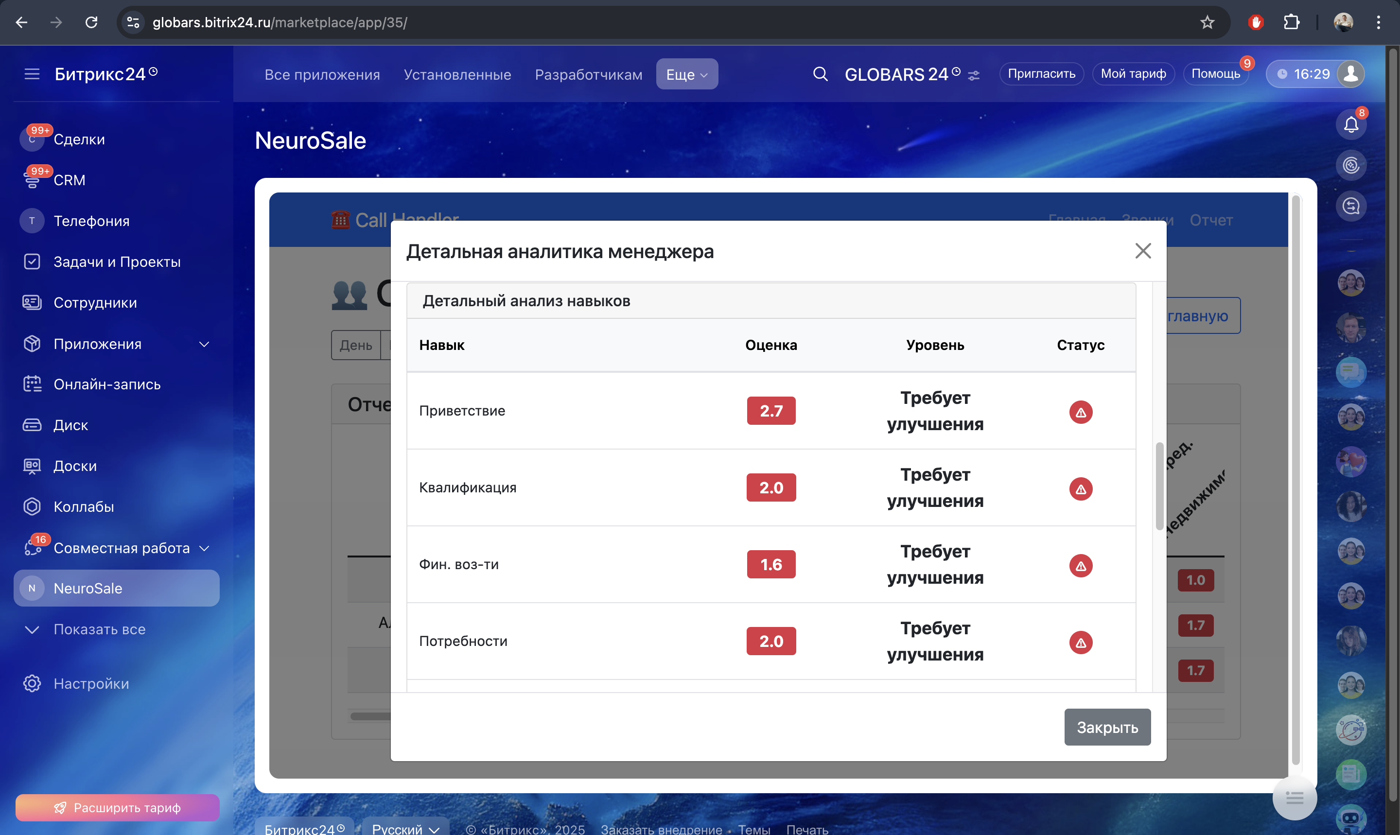 • Интеграция с CRM: Вы получаете оценку по каждому звонку прямо в карточке сделки, что обеспечивает бесшовный рабочий процесс для руководителя.