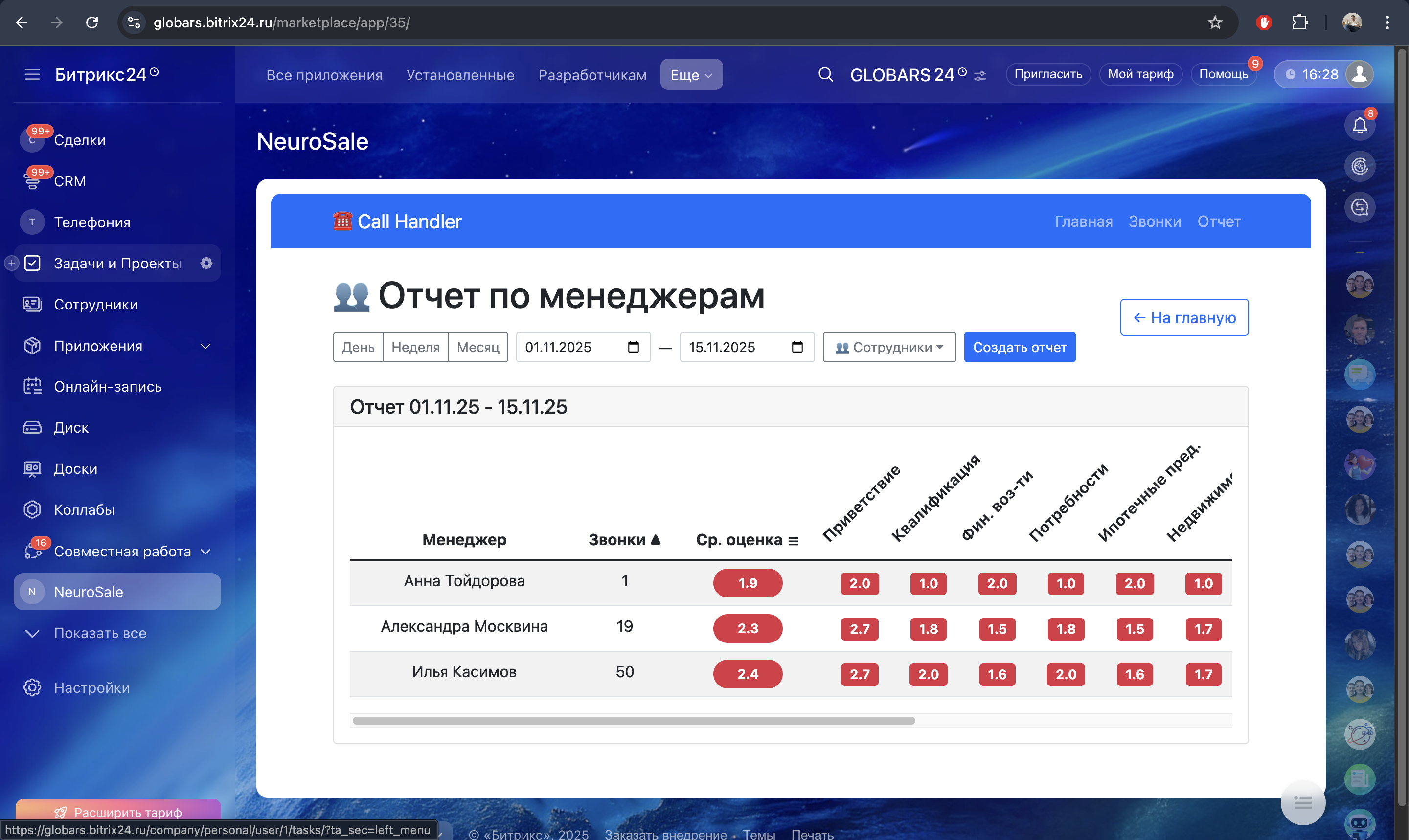 • Анализ 100% звонков: Сервис транскрибирует и оценивает каждый разговор менеджеров по 15 ключевым критериям (открытие диалога, выявление потребностей, презентация УТП, работа с возражениями, закрытие на следующий шаг).