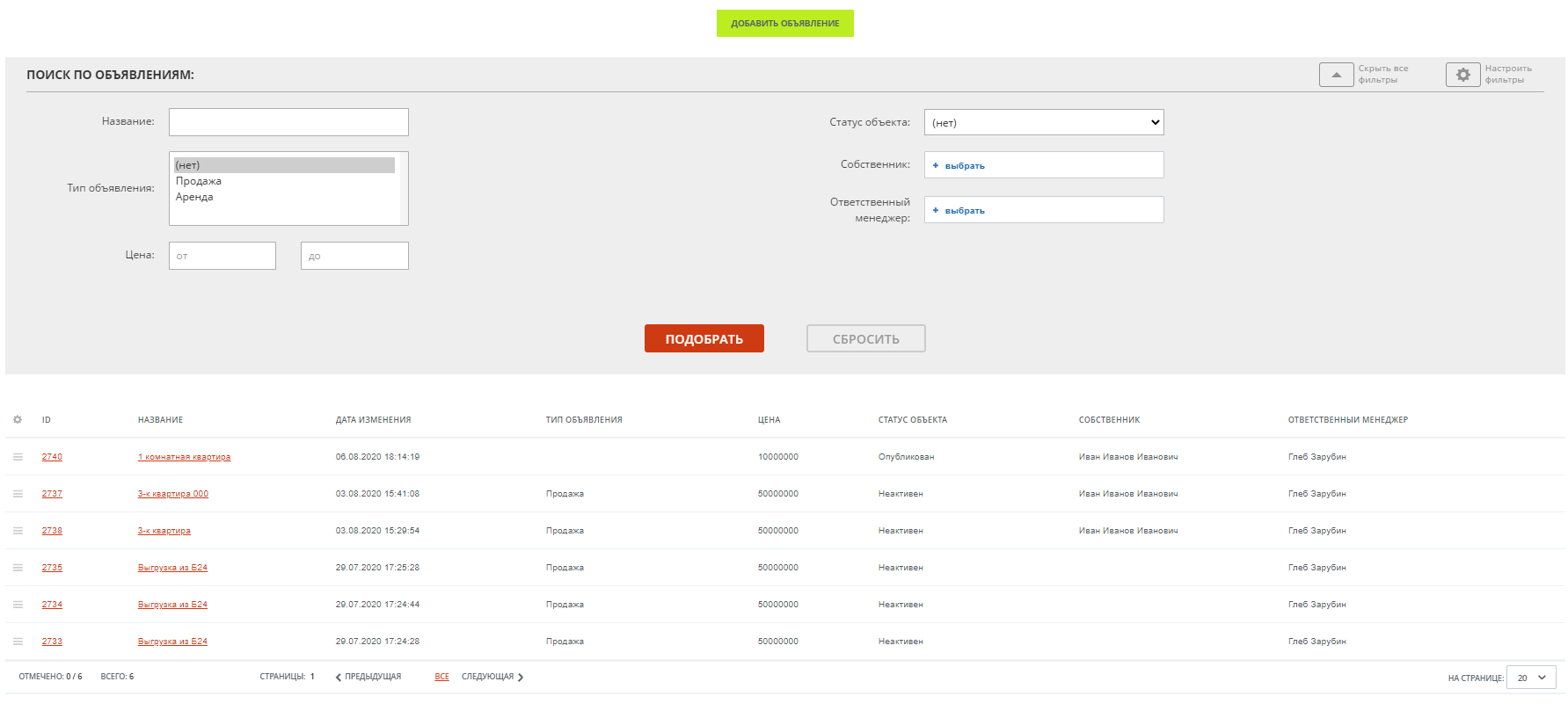 Предусмотрен поиск объявлений по наименованию, типу объявления, цене, статусу объекта, собственнику и ответственному менеджеру.