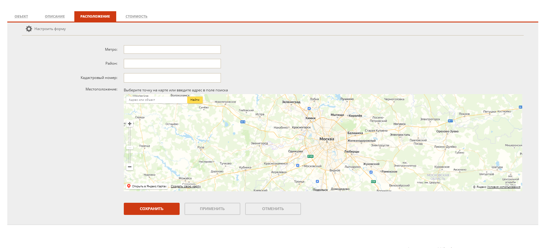 Для выбора месторасположения объекта недвижимости на вкладке “Расположение” можно использовать как ручной ввод объекта, так и выбор объекта на карте.