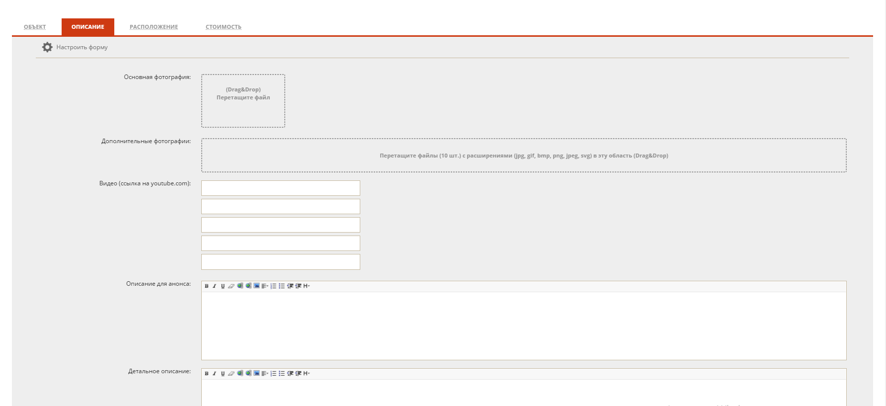 Дальнейшие вкладки описывают характеристики недвижимости и зависят от раздела, в котором будет располагаться объект недвижимости на сайте.