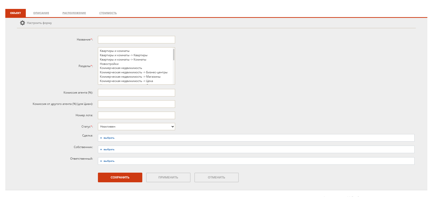 Для заполнения информации по объекту недвижимости неизменными остаются вкладки: объект, описание, расположение, стоимость. Заполнение прочих вкладок зависит от выбора Раздела на первой вкладке, в котором будет находится объект недвижимости, то есть от вида недвижимости, типа объявления.