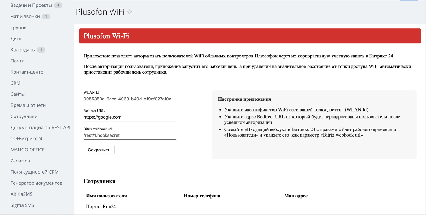 Приложение позволяет авторизовать пользователей WiFi облачных контроллеров Плюсофон через вашу корпоративную учетную запись в Битрикс 24