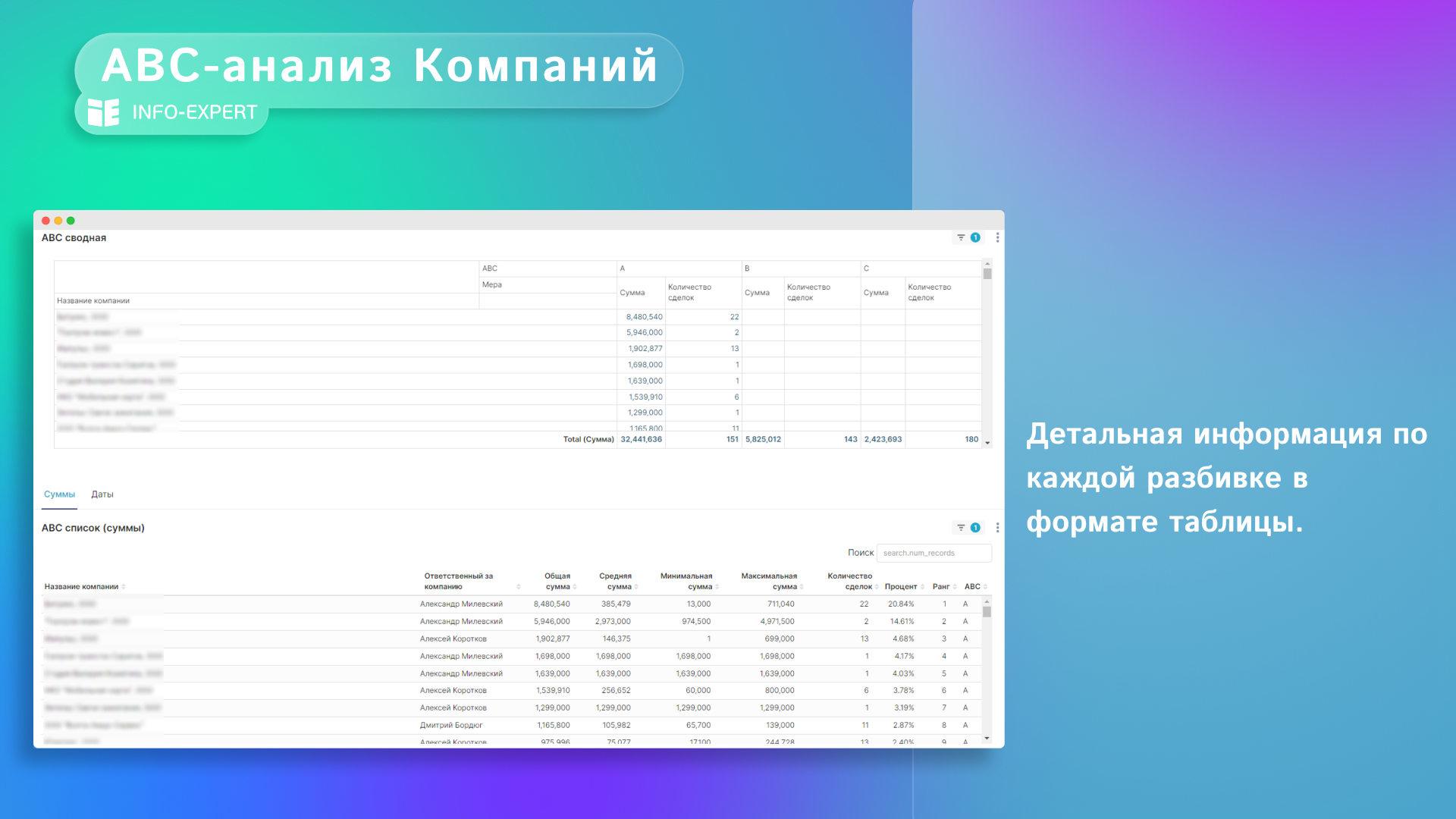 Отчет соберет информацию об успешных сделках за выбранный период, сопоставит эти сделки с компаниями и посчитает общую выручку с каждой компании. Затем для каждой компании будет рассчитано, какую долю от всей выручки за выбранный период она принесла. По этому показателю компании будут распределены между группами A, B и C: