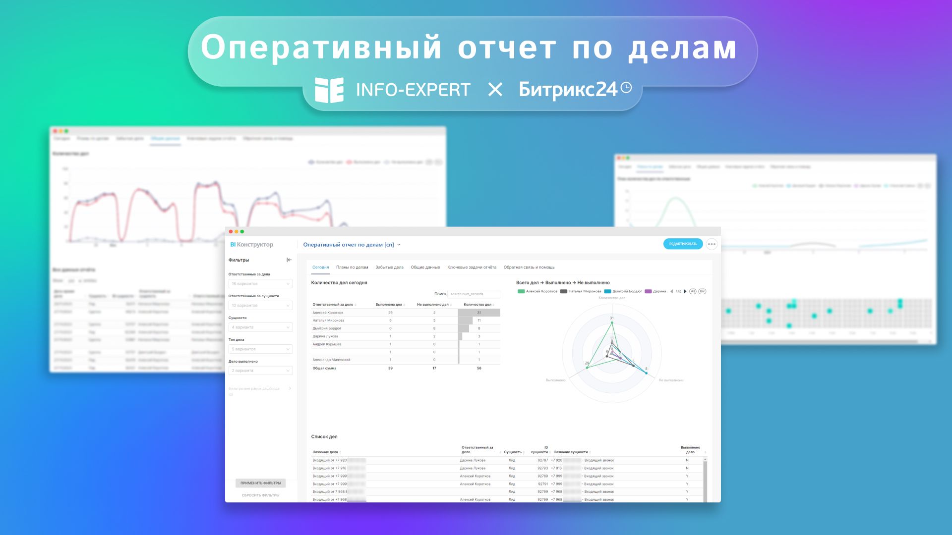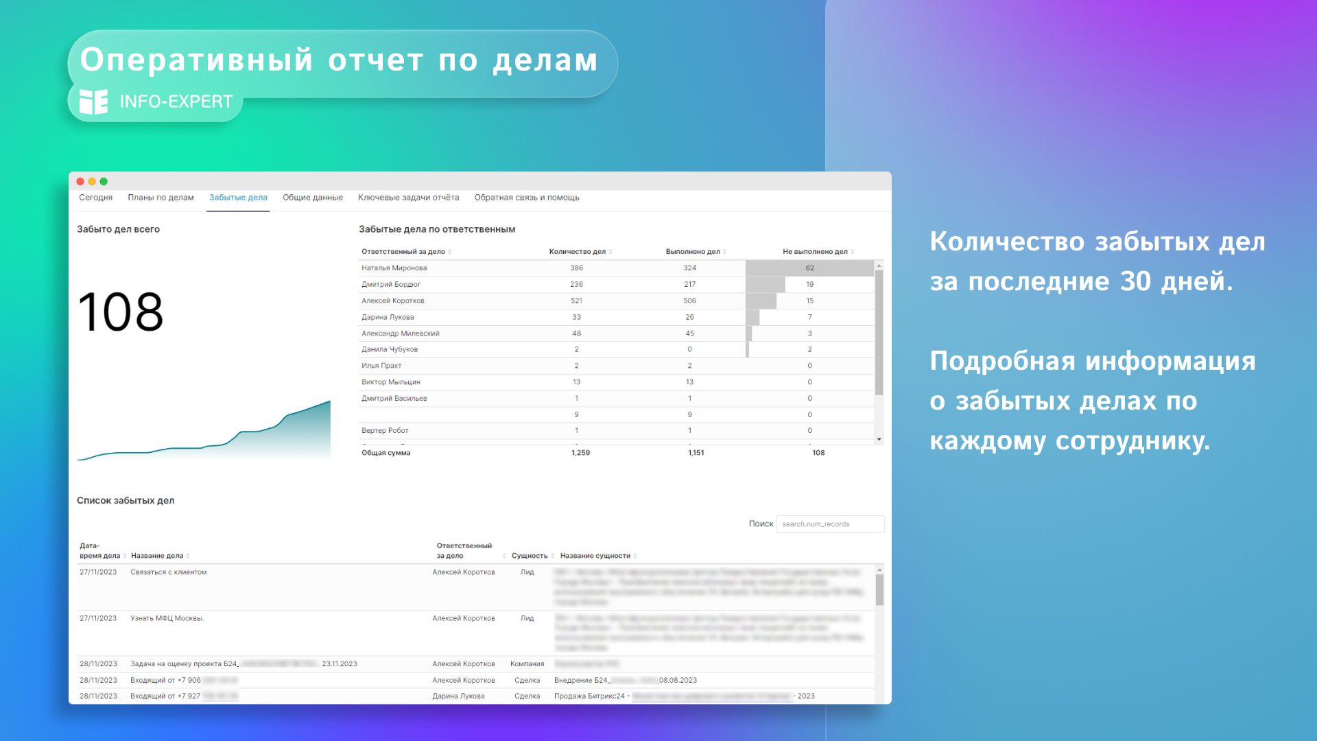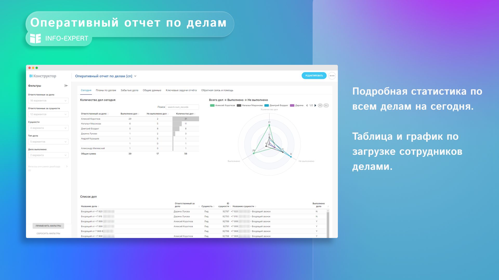 Отчёт, построенный в BI-конструкторе, в наглядной форме покажет данные о делах за текущий день, забытых и запланированных делах.