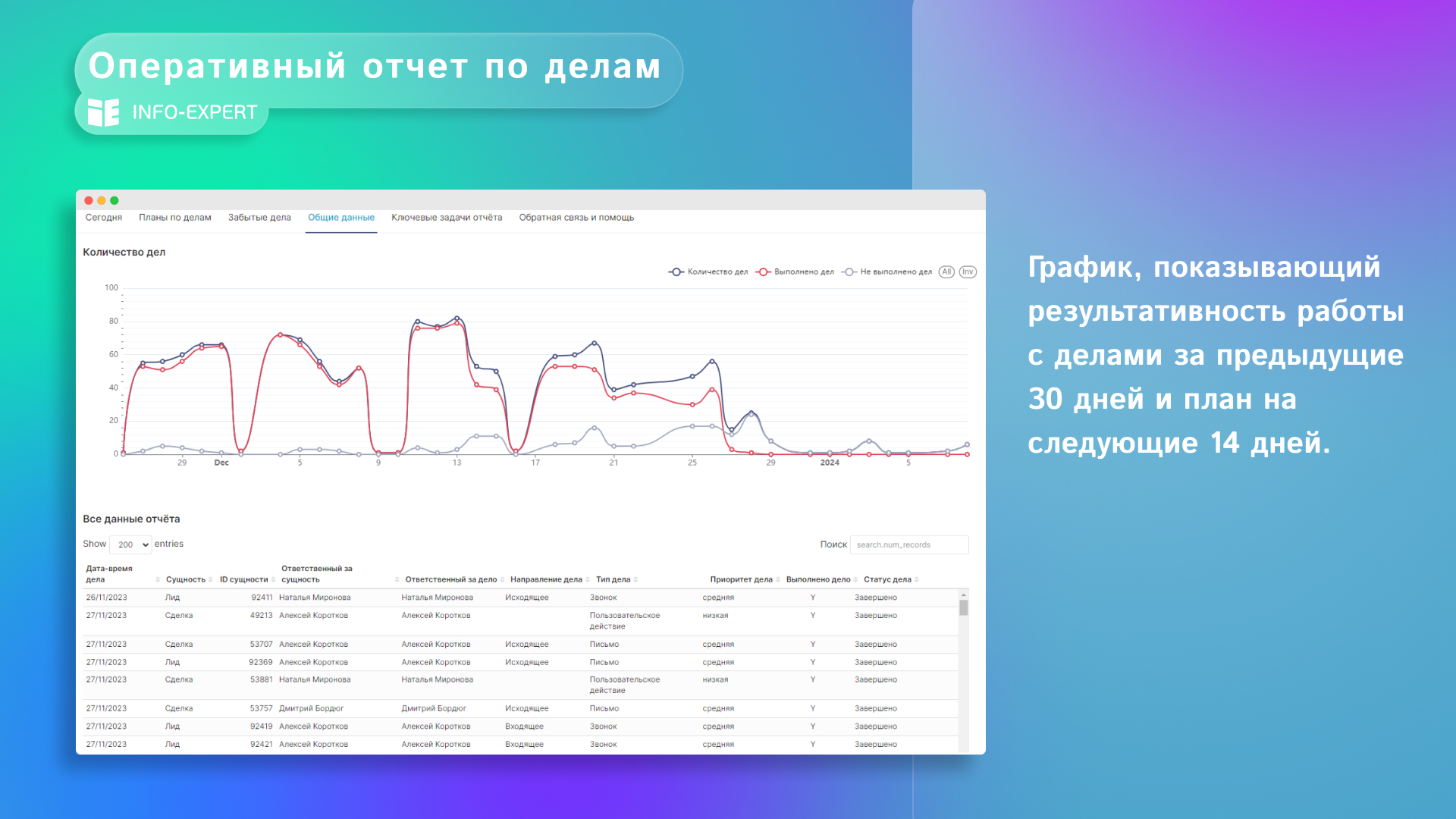 Также есть таблица с разбивкой по ответственным, в которой можно увидеть, сколько всего дел было запланировано у каждого ответственного, сколько из них он выполнил, а сколько забыл.